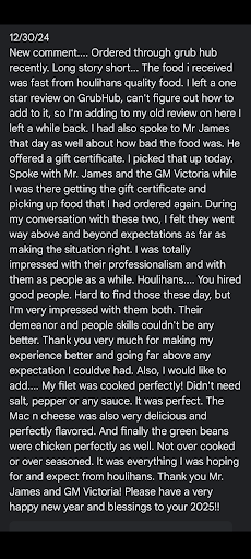Ā Ā Ā Read moreHaven't been to Houlihan's since the Plaza but always pass by this one and said that we would put it on our list of places to check out...well today was that day for moms and I to check it out,started out waiting on a table but there was no wait in the restaurant...then we ordered the shrimp and lobster dip which was ok...then I decided to take a chance on the Prime Rib which I was very skeptical, moms even ordered one...well I ordered medium because everyone's Temps vary..it was very rare,no problem I ask to bring it up just a little but I didn't want it to look like my mother's mwell and she said ok,ok no problem I got you 2min.top I said yes..so she tells me to keep my sides, a twice bake potato and some asparagus so I did...and then the wait started...after 10 min I knew we were going to have a problem, so she says it's ready just the way you ordered it and then I waited 5min more..she finally sat it down and yes in fact it looked just like my mother's and I was very upset so she says well I will just charge you for the sides and I said i didn't come out for sides I came out for steak and I wouldn't have eaten the sides if I wasn't waiting for my steak,the whole plate should have been re-done..so she gets the Mgr. She was very professional and courtesy a nd handled the situation so kudos to her..she sent us home with desert but I am still hungry from no dinner,she offered but I refused,was so upset didn't get a pic of mine sorry..(was contacted by the owner or someone at the head office said they were going to make it right by sending me a gift card to return. ..that's been months ago,doesn't surprise me, that's a š reflection I suppose. ..why even reach out to only offer false...