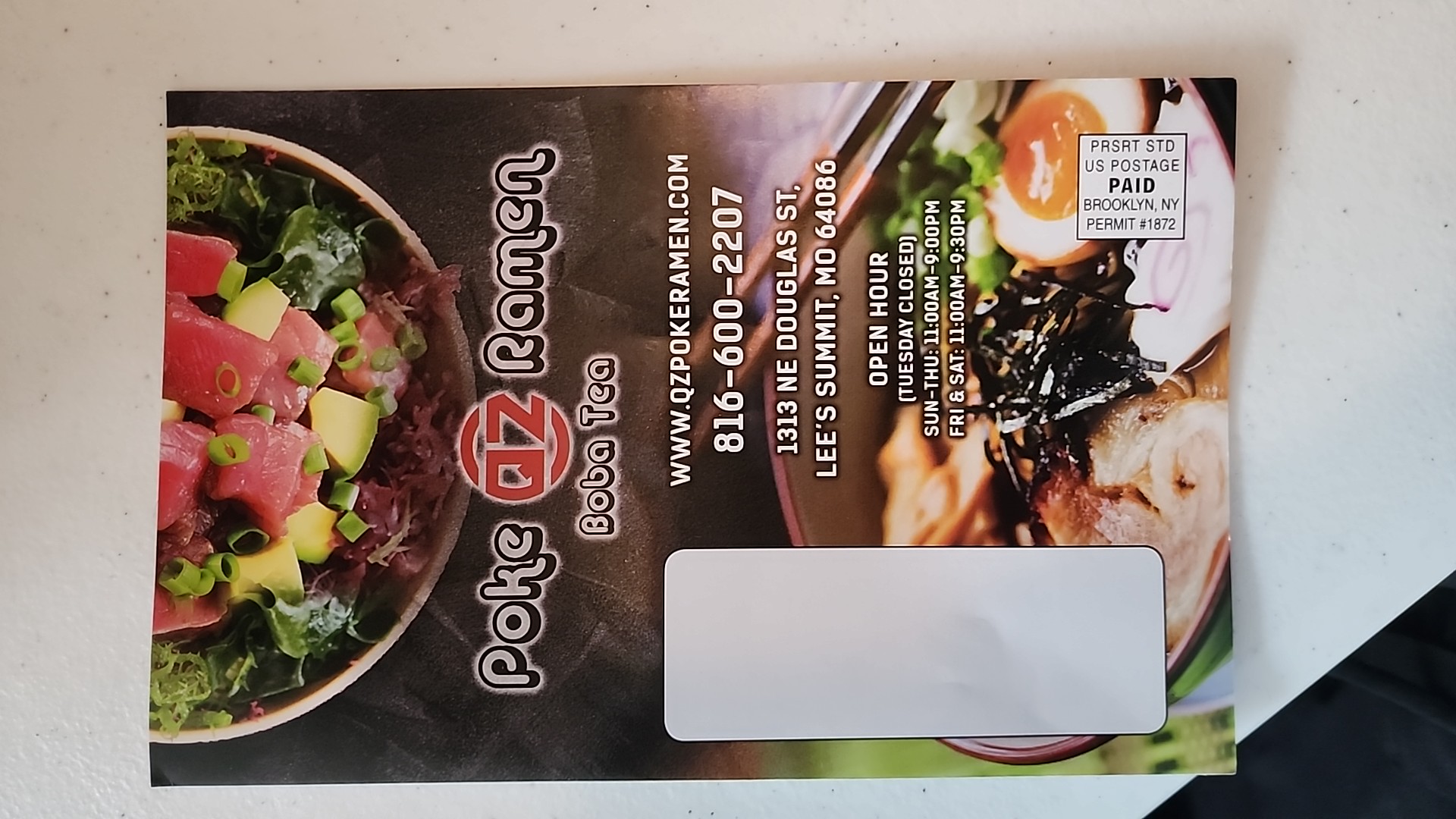 Read moreGiven the lack of Asian American food options in Lee's Summit, and the complete lack of ramen, I was really excited about this place. The overall vibe and atmosphere is good, and service was fine (though you order on a screen and it can be a slow process). I ordered the signature pork ramen (tonkotsu with pork belly), since that's what I would normally order at a ramen restaurant. I also got a coffee latte milk tea boba. Sadly, the food was not good--awful in fact. I typically devour an entire huge bowl of ramen, and I couldn't finish half of what they gave me, which was a small portion compared to what you would get at a premier ramen place like Ramen Bowls in Lawrence, KS.