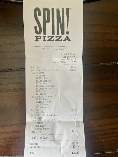 Read moreMy daughter (Trinity) already made a post but I wanted to add on for clarification and receipts that what she stated is very true. We were treated very rudely by the red headed (I'm assuming shift lead?). Her body language was disrespectful and to come over and ask "what's the issue?" when all I told the waitress that brought us our food, that mine was incorrect, is just not okay. As a "manager" on duty, this girl should have been the one coming up to us with respect and sharing her concerns that she is sorry her staff couldn't follow very simple directions as shown on the receipt. I do have severe allergies and I did not "choose" to be specific on the receipt of what I needed removed, my body does that for me. At this point, I'm very unsure if I will ever return to this specific location, as there have multiple screwups in the last year. In addition to the food being made incorrectly, I left with half of my Mini Mia Pizza uneaten, as the pizza dough was uncooked! Spin Pizza Marketing Team, this is not acceptable and will not be...