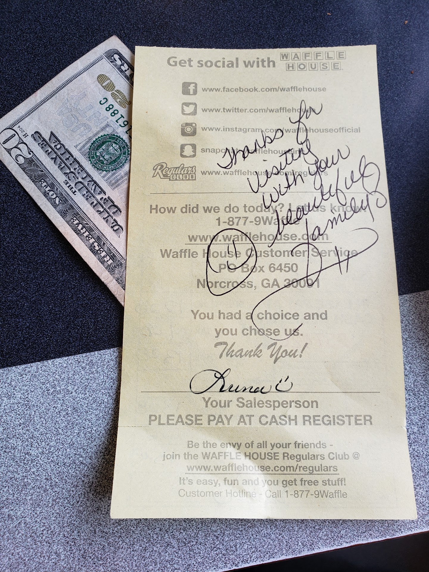 Oh, and if you're thinking of stopping here because you don't want to wait for the what-a-burger up the street it's a good call. I've ate at this Waffle House, including paying, in less time than I've waited on 5 cars there. It's actually what drove me to try this location so thanks to What A...