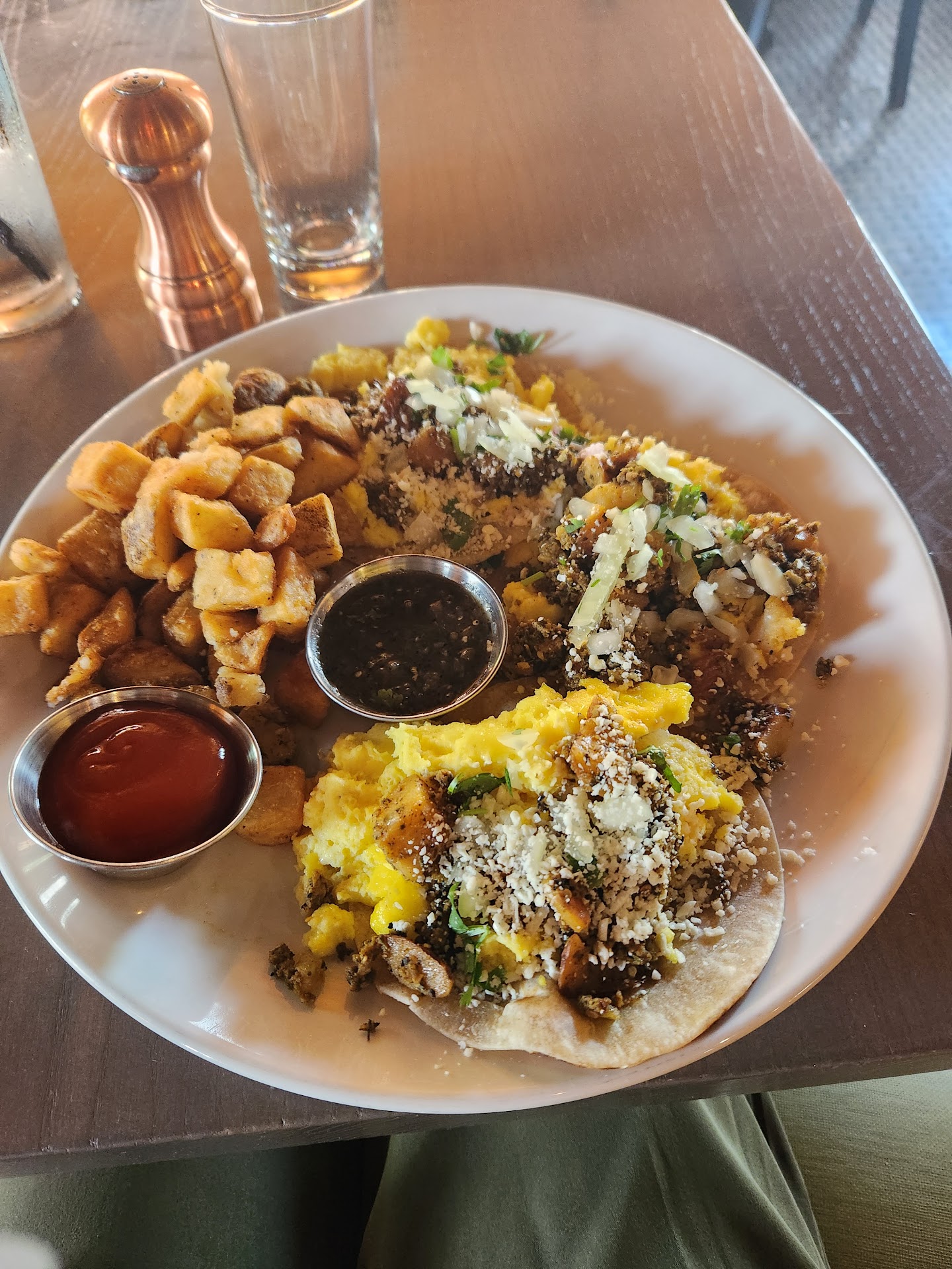 Read moreOne of my favorite brunch spots in KCMO. I LOVE their shrimp and grits & blackened shrimp tacos. I typically get that every time I go , which is pretty often. I’ve also tasted their chicken wings, social burgers / fries and other items and are all very good as well. My problem actually comes from my two favorites , the grits and tacos which is disappointing. They are never consistent with how it tastes. I notice in the morning it tastes delicious and is VERY flavorful. Towards early afternoon ( 2:30pm ) is when I went yesterday , that it tastes so bland and is even missing some ingredients that are usually there in the morning. I’m not sure the type of meat they put in it, maybe sausage? Whatever it is , is NEVER there in the afternoon. On top of that it just tastes so bland. Also have to use a few times where shrimp is a little undercooked. Being that shrimp only takes about 2 mins to make is crazy for it to be undercooked in any way. Shrimp is a very good size and tastes great when thoroughly cooked though. Lastly, I don’t appreciate how when you ask for utensils, and the servers, place the utensils directly on the table. I’m not sure if it’s just me, but I do not want to eat off of utensils that have touched the bare tables. Also, when I was being seated, the lady placed my menu right on top of the utensils, I originally had on the table, which is also gross, considering how many people touch the menus. All in all, I still enjoy this brunch spot, and of course will be returning, but likely only in the morning if I want...