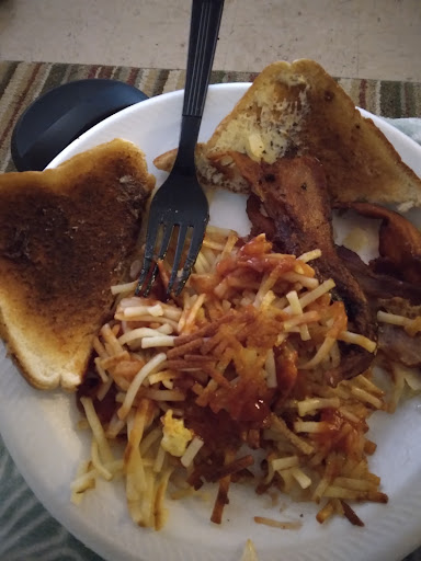 Upon receiving my order my waitress great server gave me my order an upon finishing my hash browns, an moving on to my breakfast sandwich found a strand of hair in my bacon. Discreetly I informed the woman of the situation an the order was fixed no hassel, now upon second attempt...my order of hash browns was burnt an covered with burnt cheese than I cared for but my sammich was my goal and my investigation of the bacon sammich found a second long hair had been cooked in the bacon fat. I alerted my waitress slightly annoyed an hungry, but kept a pleasant composure. However the female manager thinking I purposely an diliverality done this hoisted the food an exclaimed it was 'fuzz' from the ceiling, implying I should get over it. Offended an honestly disgusted I was done, after seeing a floating strip picked up by ultra blonde thread of hair, honestly gagged an insulted. Let's say....I left the establishment. An new sheet will of wanting to avoid that place. So moral of the story....check your food, throughly an be mindful. This story it wasn't the waistress fault she did awesome doing her best to serve me, I blame the cooks an bad manager in this situation. Least I didn't have to pay after this back to back incident.