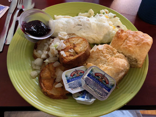 I had a “Build Your Own” omelet. (misleading as THEY actually build it…but you get to decide what goes in it. I had onions and cheddar cheese, made with egg whites. It was prepared perfectly (not always a given with egg whites. It came with house made jam (delicious), a couple of truly legitimate southern biscuits as my bread option (delicious with the jame and butter) and potatoes. These potatoes were thick round discs of potato…PERFECTLY cooked, crispy on outside and tender on the inside. One of the best breakfast potatoes I’ve had.