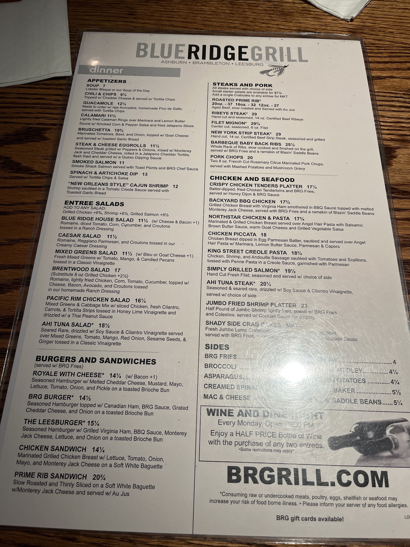 Update 2/5 - had to take away a star after I received my AHI tuna. DO NOT order the AHI tuna until they learn how to make it. A slap of raw tuna seared with a hand held burner is NOT how you do it guys! You have to actually SEAR the tuna in a pan and this is best when u have some fat and some crust to work with like a blacken seasoning and butter or olive oil , or almond crusted panko crusted. Blue ridge did not have the tuna down in so sorry. I did get the manager to switch it to simple grilled salmon they had and that was perfectly cooked and brought me back to a happy place. Thank you- great management. Oh and our server sucked. I know we went at closing hour but it wasn't that they vacuumed around us but she never filled our water u til my husband drank all of mine, and we didn't get visit after that other than when we called the for a bill. All other tables got bread and butter basket , we did not despite waiting a bit for our food. Husband had to ask for steak sauce from another server. And I ended up just getting napkins that were laying around in the corners. We will go back- in time, Bc the food we're absolutely delicious - Nu husband raves about his NY strip being perfect and that's never heard of so definitely good food just stay away from AHI tuna. Childrens menu was great portions as well - oh and amazing grilled chicken breast on the kids menu ( a little salty but perfectly seasoned for adults - need less salt for kids ). Max and cheese was good but they used cheese sauce not real cheese and I am not a fan of that. I would normally take two stars off for all of this but I did not bc restrooms were also clean and great size and they did have baby changing table. So I am still giving them 4 stars ⭐️⭐️ ⭐️ ⭐️ which I dont give out easily on my reviews. I hope you enjoy...