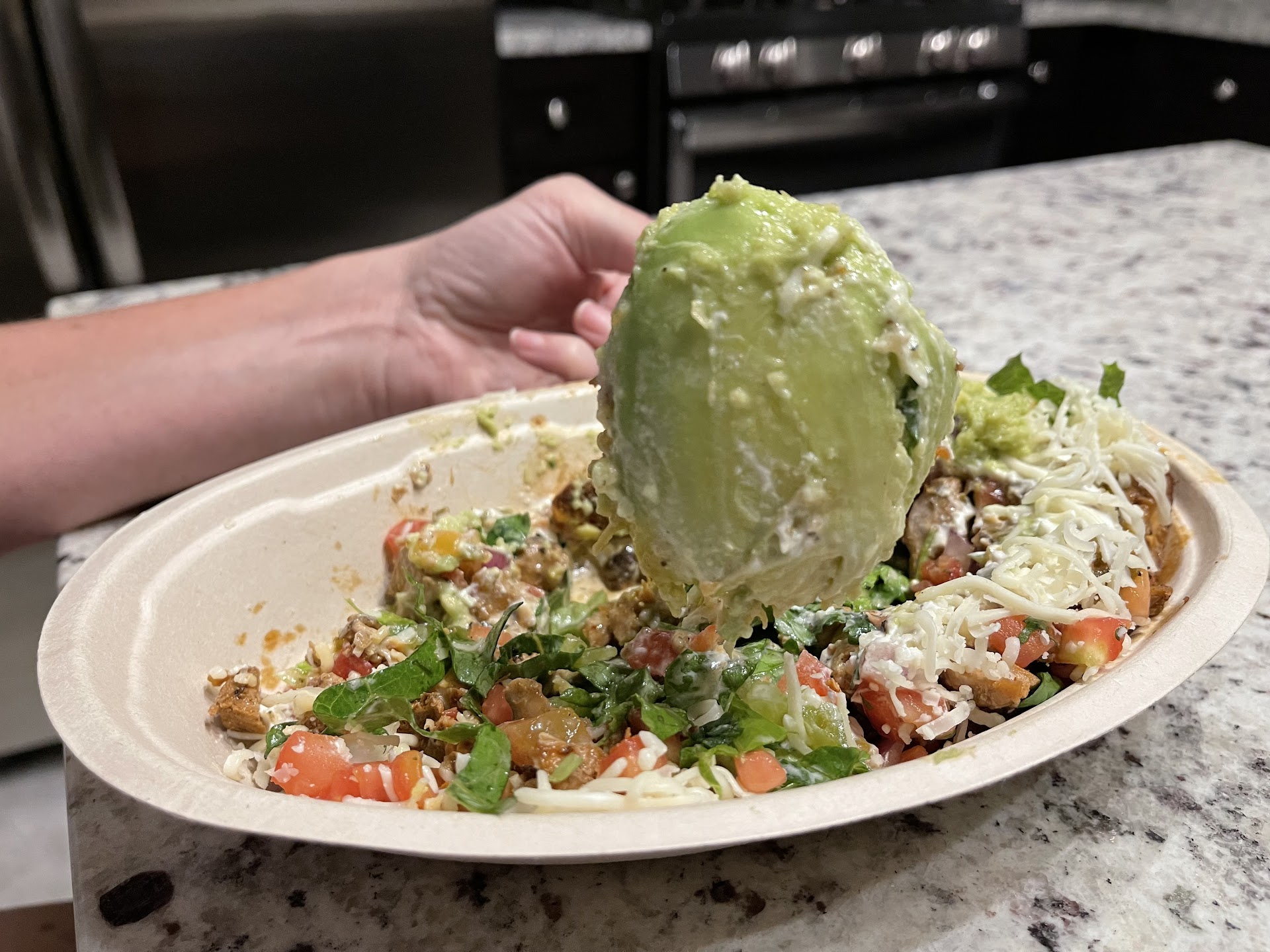 Daughter ordered the burrito bowl and guac and chips from -unnamed delivery service- . You can see from the picture it seems Chipotle are dumping what looks like left over 2-day old food into the delivery services that get picked up at the end of the day. No one is able to complain or send it back in person I guess right, Chipotle?