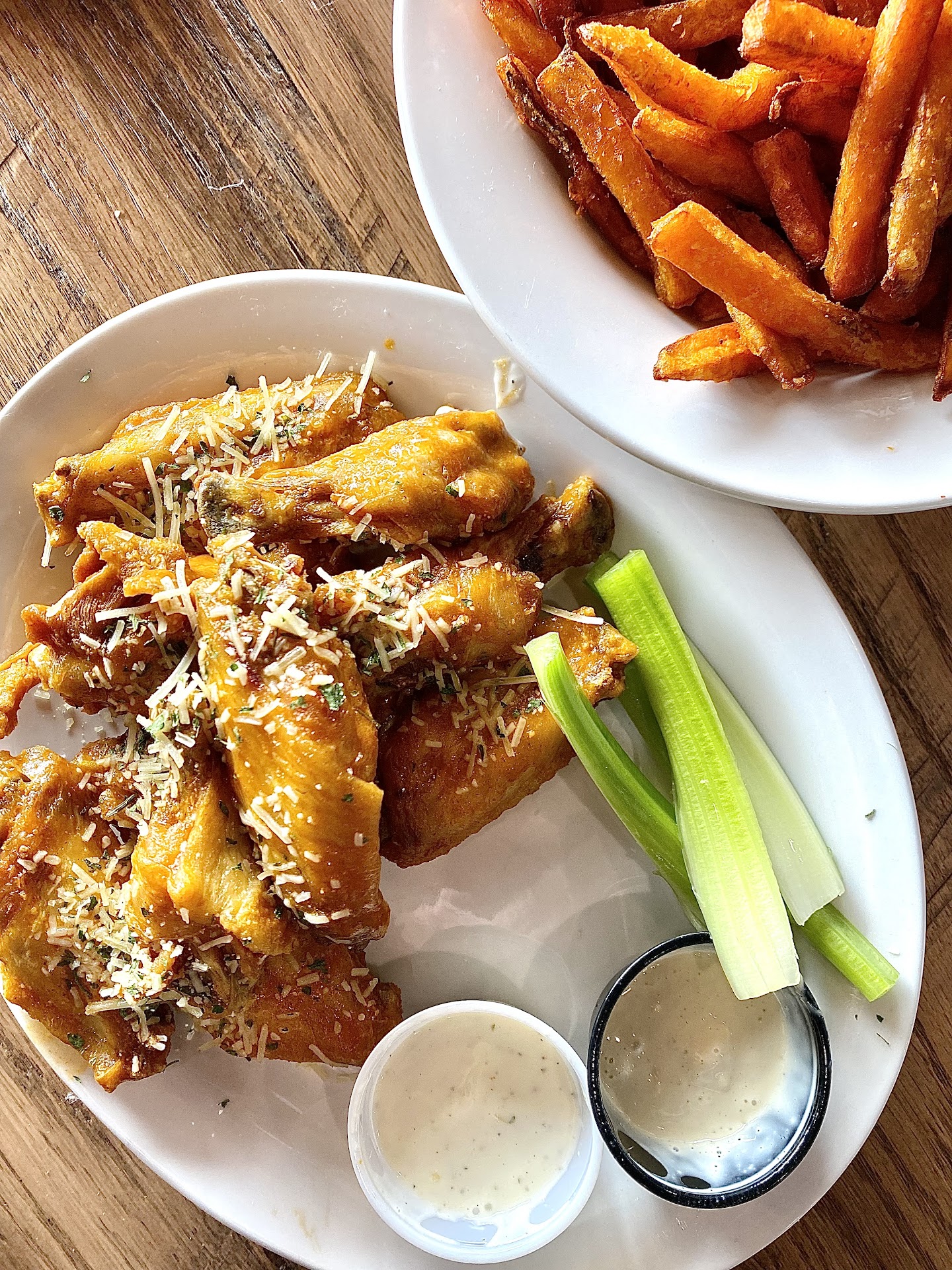Service: Slow...so slow. I think my server had entirely too many tables. When my meal came out, the empty appetizer plate wasn't taken away, and the server didn't drop off any extra napkins or wet wipes for the wings. This is a WING place, extra napkins and wet naps should be a given for an order of wings. Had to ask a different server (I actually think it was a food runner) for a drink refill, as my server went missing for at least 15 minutes. I was with another person who ordered the chicken Caesar wrap and asked to substitute the fries for sweet potato fries. Both types of fries showed up and I was of course charged extra for the sweet potato fries. I wasn't going to argue about it (mostly because I was running short on time based on how long everything else took) but the order was made clear "Instead of fries can I have sweet potato fries" oh well.