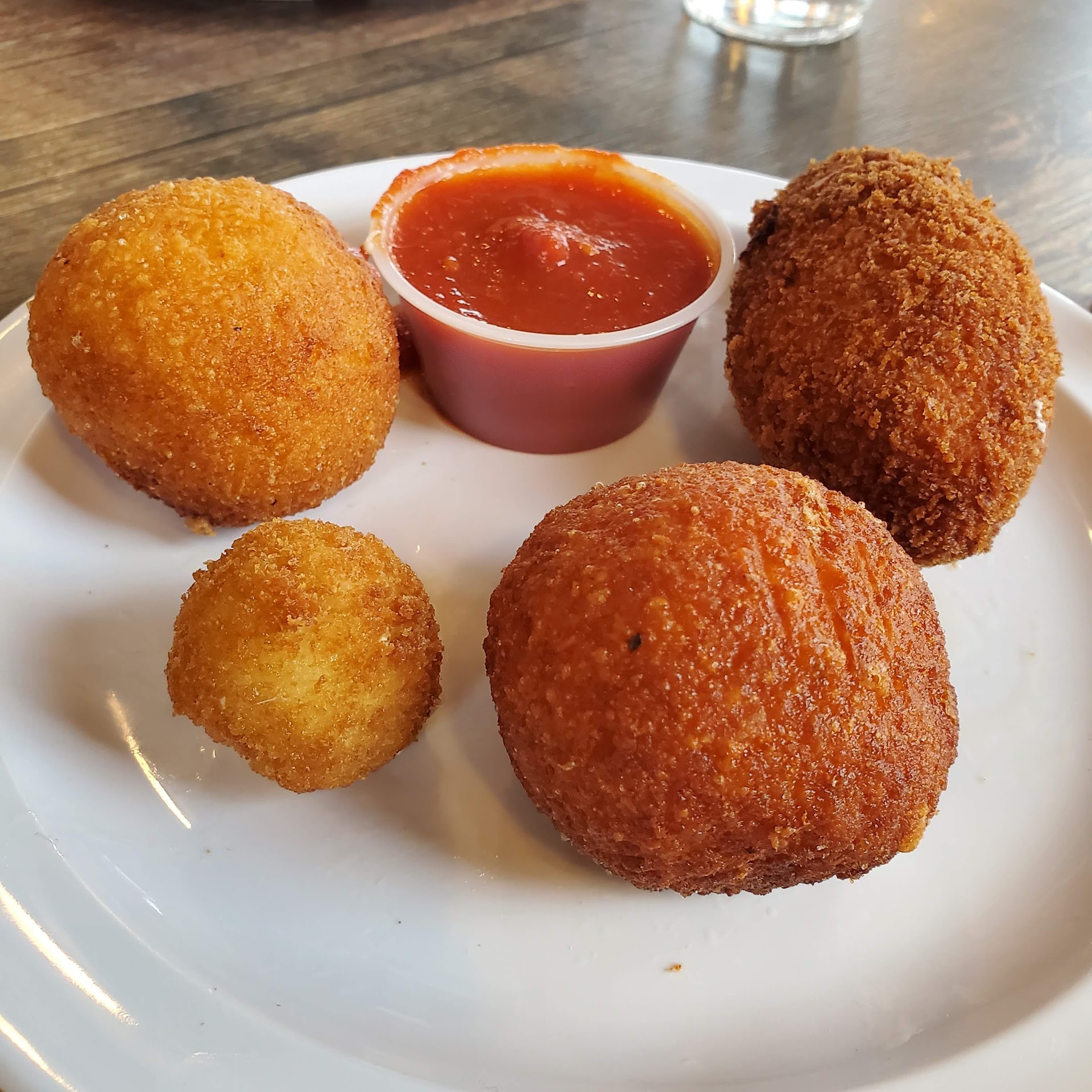 Started with the Frittura sampler. One sausage arancino, one eggplant arancino, one panzarotto and two fried mozzarella balls with marinara (only one in photo because my hungry toddler has the fastest hands in the East). Peak aroncini. The method is flawless. Other than changing the flavors of the ingredients to suit personal tastes, you couldn't get better. The marinara is a little oversweet for my tastes, but it's great for what it is.