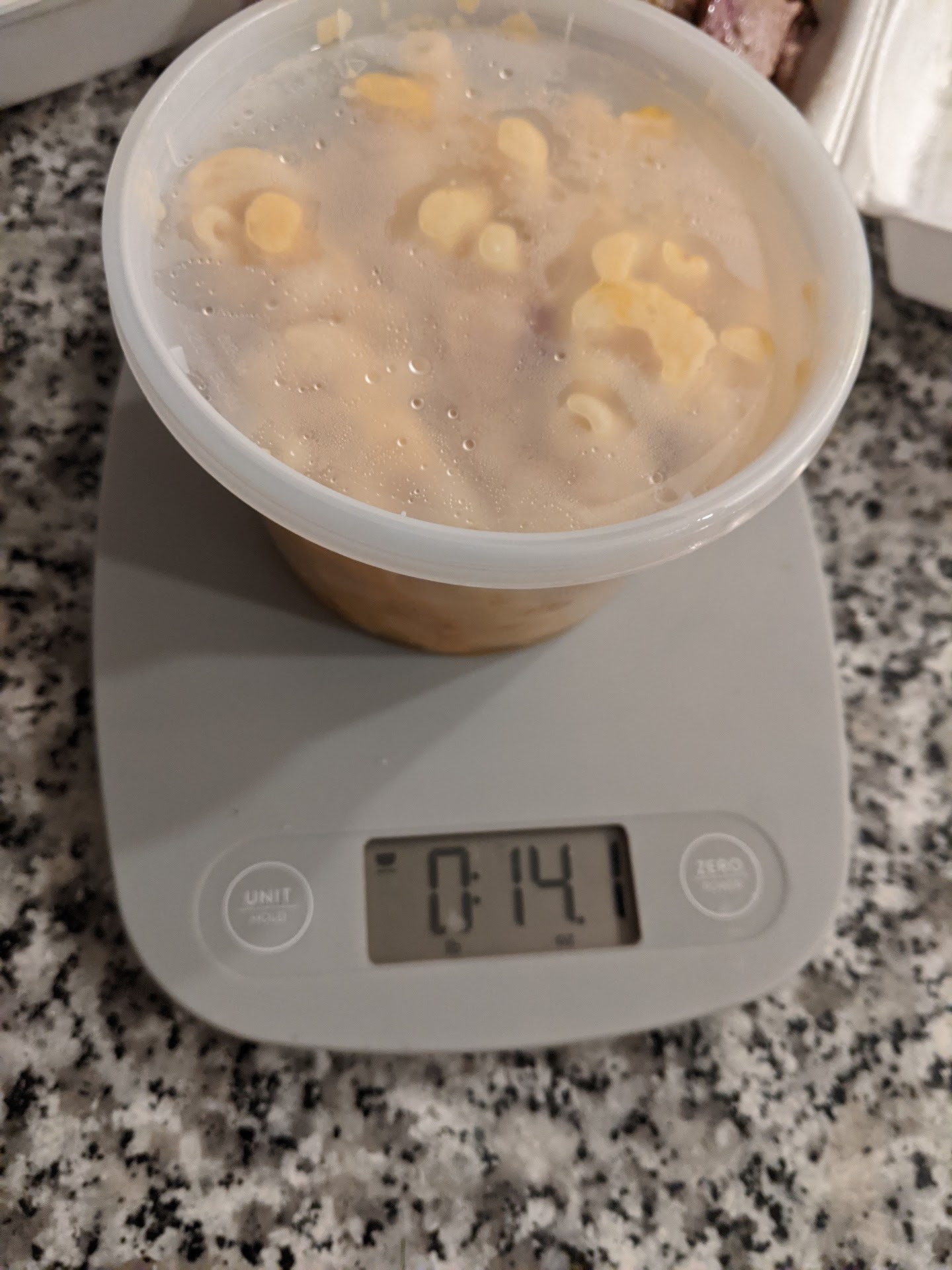 Portions: Lacking However when we got home and saw what we had received, we we're shocked, the portions seemed very small. I figured it must be the way the food was presented since we bought by weight- not as a platter, but after weighing the food, each came up short. Note: the container weight also contributed to the food weight. I should also mention that I wouldn't normally break out the scale, but when you order a half lb of meat, and you only see two pieces, you get concerned. I also don't expect portions to be exact, but I would sure hope that at least one of the items ordered met expectations. Regardless, when you pay for 16oz of mac and get less that 14 (assuming the container weights more than 0.1oz), or 8oz of brisket and get less than 6.5oz (~80% of the expected weight), it's incredibly disappointing.