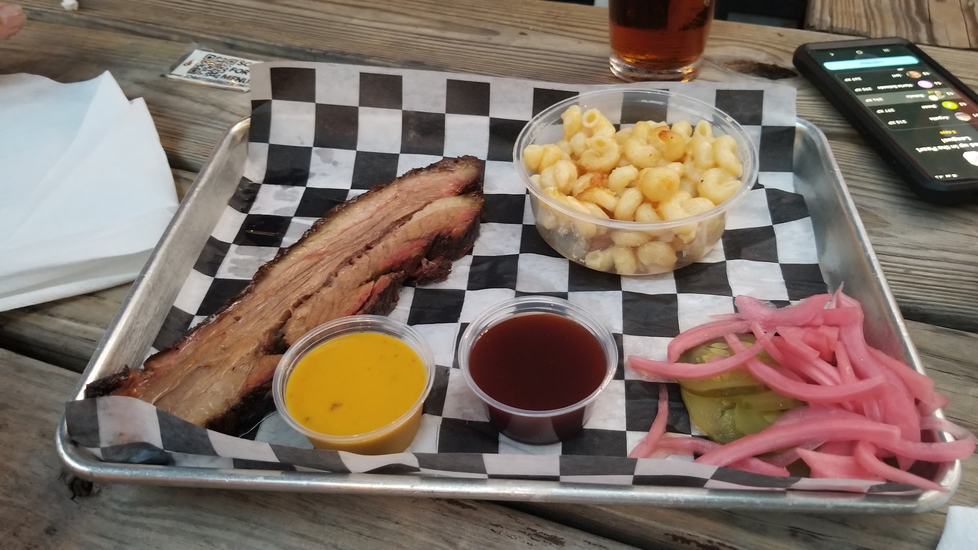 Taste: Mixed Mac n Cheese - Run of the mill. Nothing special. Not bad, just nothing to write home about. Pulled Pork - Bland. It was tender and had smoke to it, but literally nothing else. Brisket - Good. Not the best I've had, but I'd put it in the around the 70th percentile compared to other Brisket I've had. It had good flavor, and was relatively tender though was just a touch dry. Sauce - Good question. Don't know. We found out once we got home that there wasn't any sauce included. This one could have been on us for not asking, but it also wasn't offered. A real shame considering that pork needed sauce.