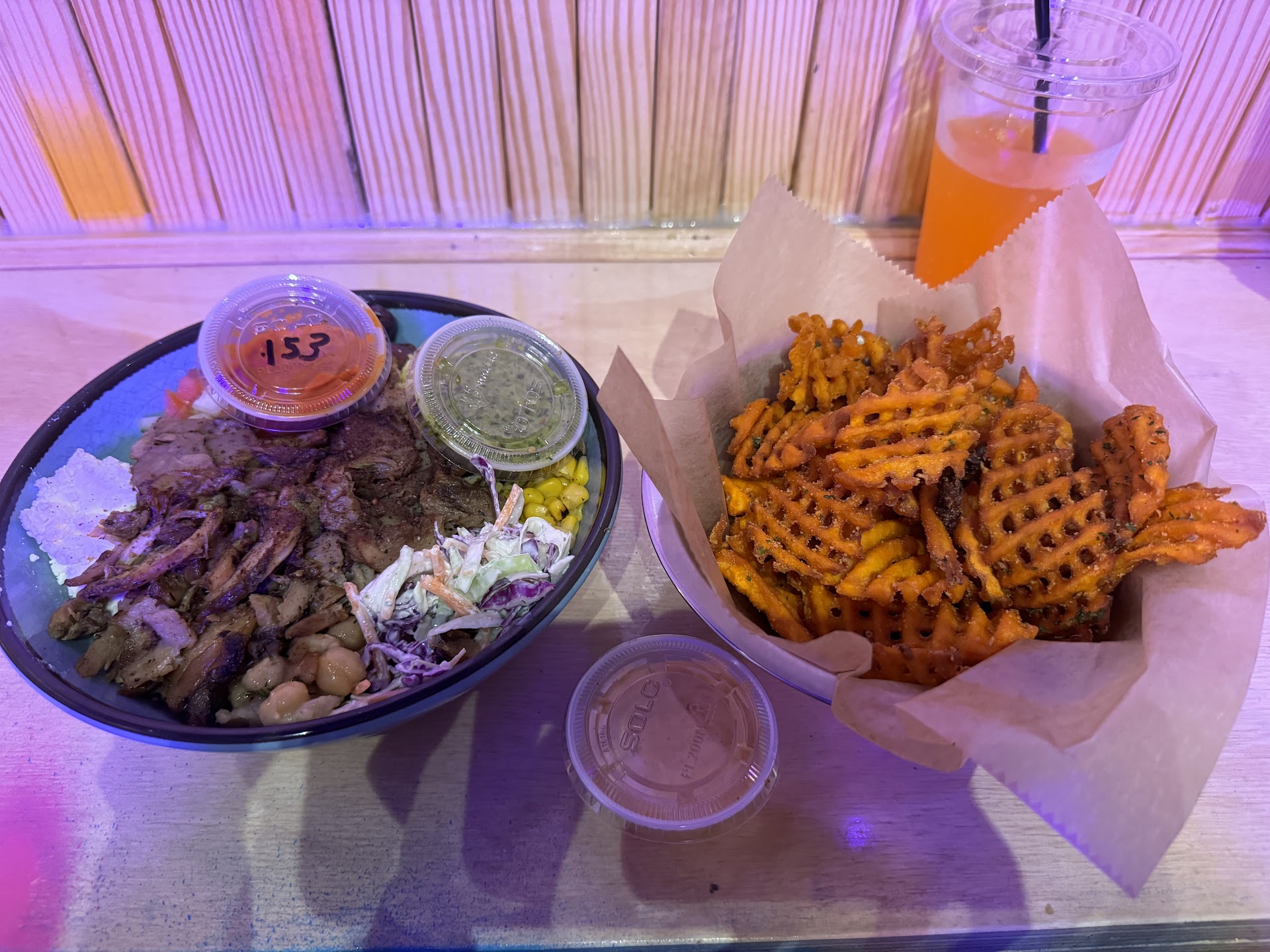 Now to the food: Mediterranean cuisine is one of my favorite cuisines, and Spitz flippin delivered on the flavors!!!! I ordered a Remix Bowl Combo with chicken and rice and a side of sweet potato waffle fries. The flavors were perfect! The portion, I think, is a healthy portion, but I would've liked a bigger portion. the waffle fries were perfectly seasoned and crunchy.