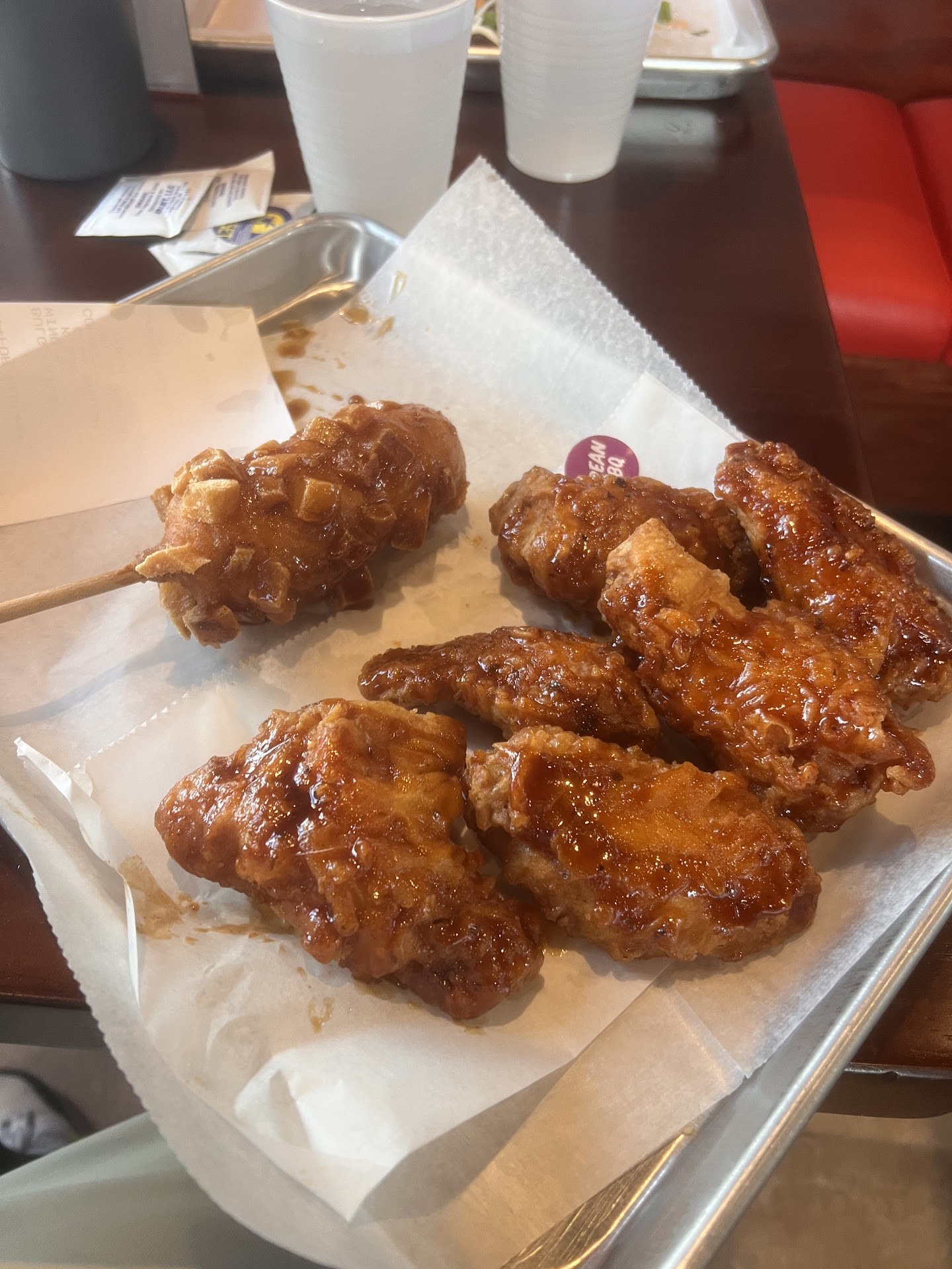 We ordered the tteok-bokki, six wings with yamyeon sauce, bulgogi fries, and an order of donuts. The tteok-bokki was very disappointing, lacking the spice, flavor, and texture we're used to with Korean food. We found them inedible and didn't finish it.
