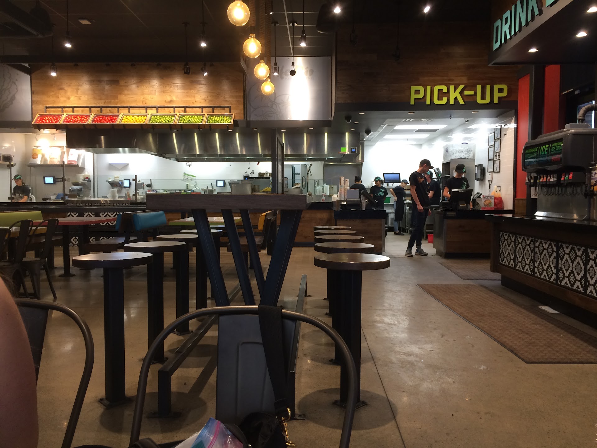 The food is still great as always, I debated giving 2 stars for that amongst the rest of our experience... However I noticed as we were walking down the line getting our burrito that things were particularly more dirty. I first noticed the rubberized coating on the handles of the tongs in the meats were all crackly, well-worn and falling off. I could only imagine finding one in my food (or even worse — having one but not finding it in my food).
