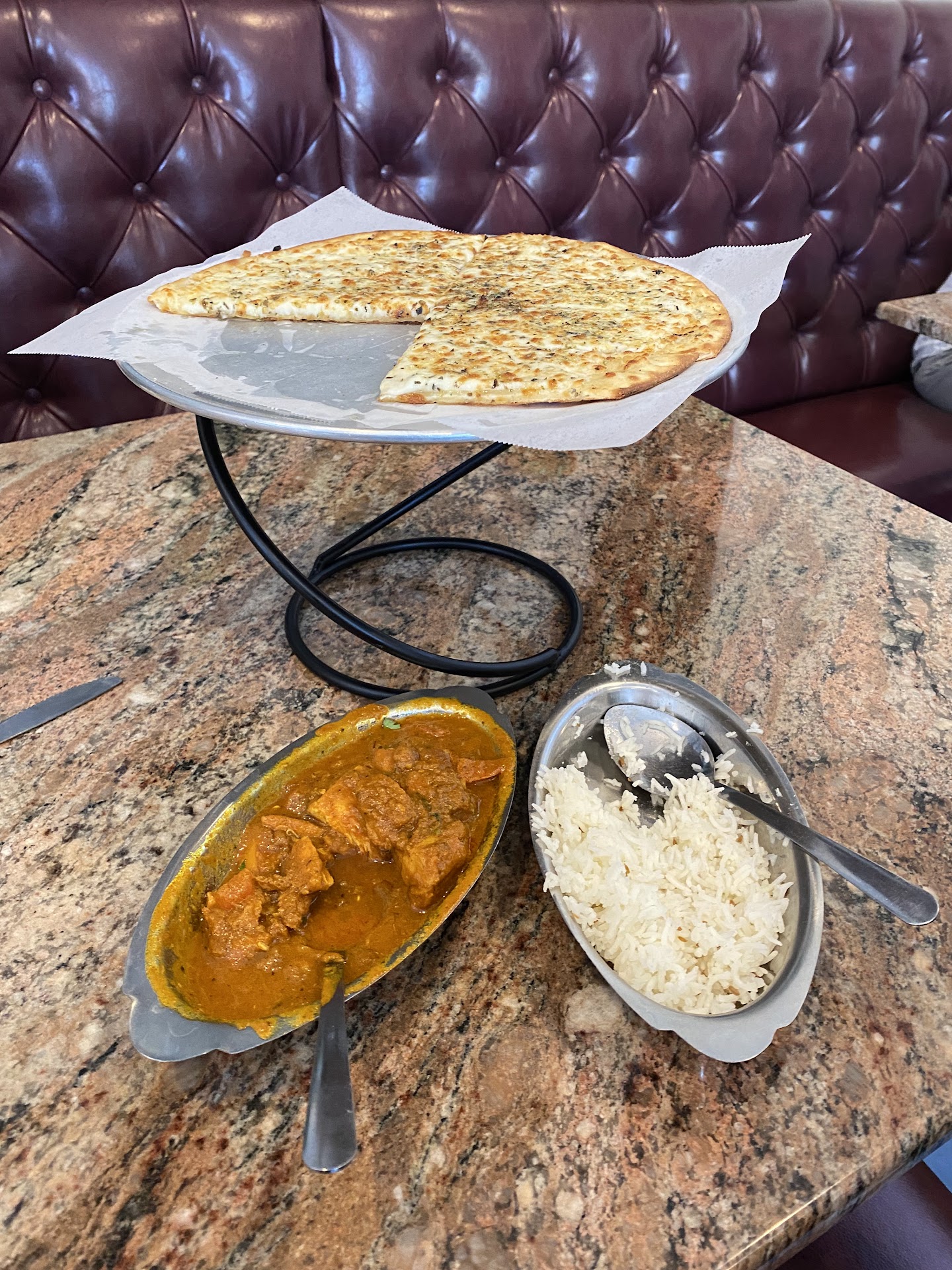 This 2nd time around, I got the Butter Chicken pizza due to the insanely hyped reviews here on Google. It was cooked beautifully and perfectly. No bubbles in the dough, perfect spread of ingredients. Perfect dough-to-ingredient ratio. And sure it was good, and had the expected yummy quintessential Indian flavor profile. (But I learned I'm even more of a wimp for spice than I thought.) And it was more filling than I expected for such a disappointingly thin pizza. (yes I'm familiar with naan bread.) Even so, I can't justify paying for pizza here again out of my own pocket. (Though I just noticed the cheaper "personal" size on the menus in people's pictures, which changes things...I don't remember that being an option for Online Ordering, but I'll need to check again once the Online menu is accessible again during business hours.) I realize this isn't a 'fast-food' pizza chain and supply chains & ingredient costs are likely notably pricier, but regardless, the amount of pizza you get for the price is hard to swallow. (If it rocked my ever-loving world like I'd hoped, and like it does for nearly all of the reviewers here, then I'd definitely reconsider.)