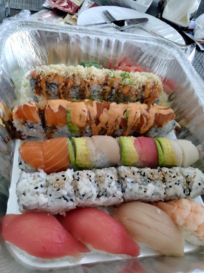 We arrived at 5:05pm. Our group consisted of 9 people, 4 couples and an unmarried sibling. We were seated within a couple minutes of arriving. Upon taking our drink order i was informed that they no longer serve the coconut water that I so loved. Oh well, I'll try the Thai sweet tea, which was good. Upon taking our order we were told that they no longer have an all you can eat menu. They now charge by the roll. Ok, we decided to give it a go. You buy two rolls and get the third free. Many of the rolls are priced differently. We all placed our orders, Mom and Dad did not order sushi, mom ordered the teriyaki chicken dinner and dad ordered the shrimp tempura dinner. All orders were placed by about 5:20pm.