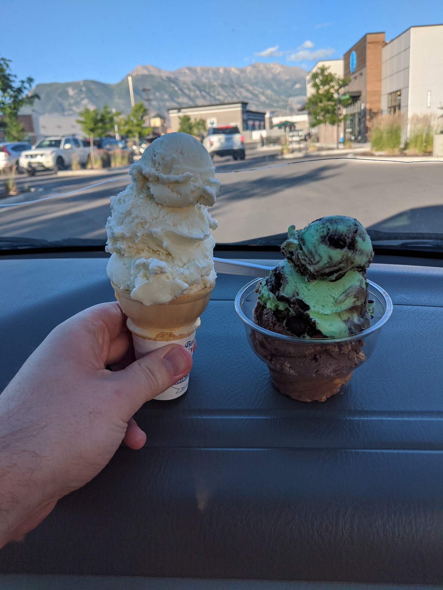 Read moreBefore we talk ice cream, just know the navigation to the Lehi, UT store is a little off. We had to make a couple u-turns and follow the signs to get there. That included parking a half block away, on a Friday night, and sprinting with masks and high elbows to the line that was already 30 deep outside the door. This may be the reason the navigation was never updated. The frenzy had begun! Picture shark week for humans, the water is overly chummed, and there's a sense of anticipation, urgency. Don't worry though, they're fast. We had 3 employees ask if we needed help with our order. Back outside, euphoric victors exit the neat white interior with triple stacked trophies in hand for all to see. Licking or biting savagely to claim their prize and be sure that it doesn't melt in the car. All eyes in the line leave the menu board and watch longingly. The good news is we are not seagulls, following these folks into the parking lot, down the street, trying to steal their bounty. Don't think I didn't consider it! "Rule#1-claim your cone and then protect it" Your family will not be as civil. Our first visit, we needed the long line to make a decision. Hesitate here and you'll pay dearly. It may be advisable to search the "menu" to know how to arrange your ice cream and then the separate "flavors" listing to make a solid decision before you enter the fray. We went with the 4 scoop sampler and weren't disappointed. All of it was fantastic! Plan on eating your ice cream shortly after departure. Unless you live close, it ain't gonna make it. Review...