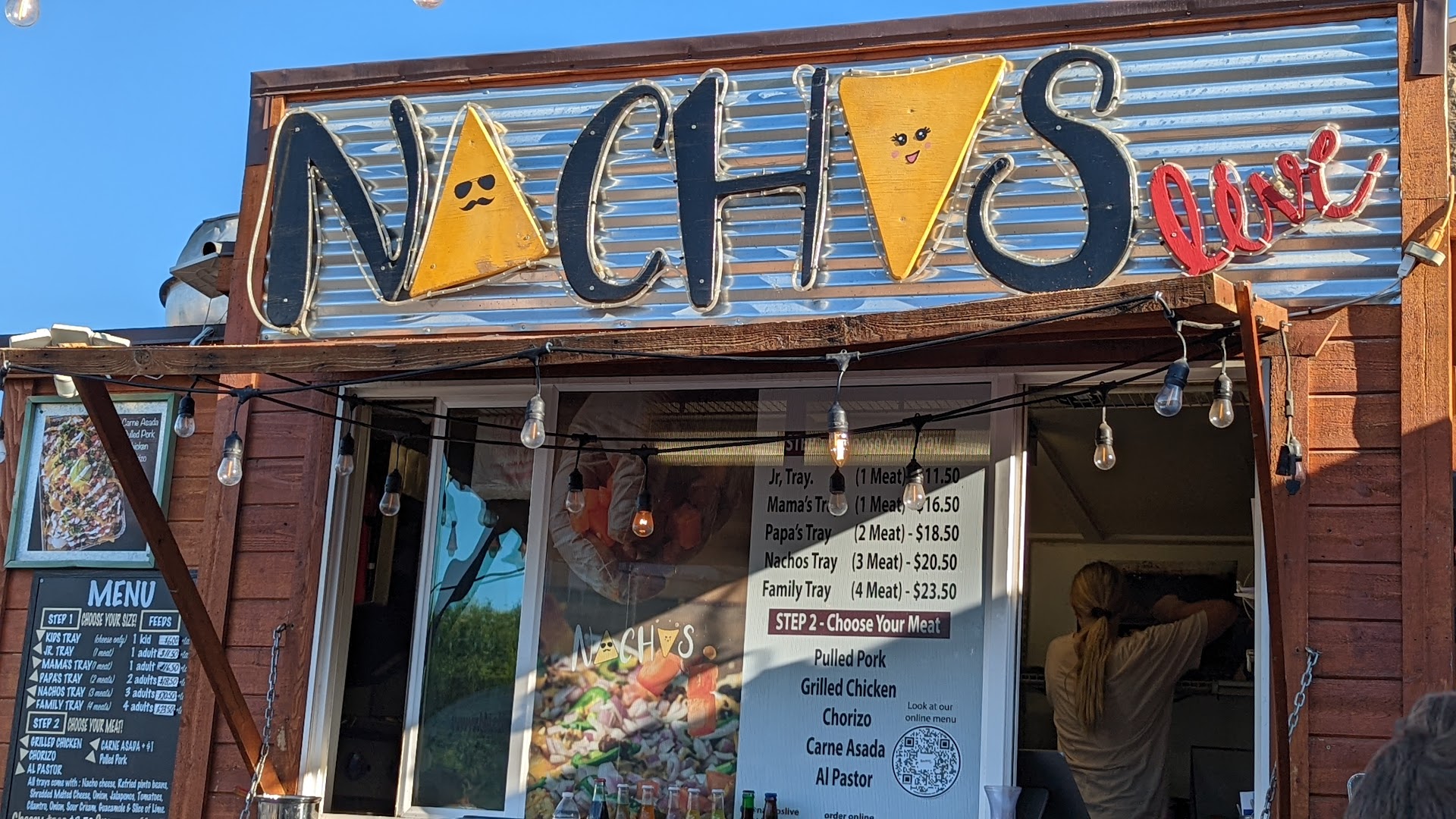 It's like a food truck/trailer turned permanent location. There isn't a lot of seating and the shade is non-existent until later in the day. Even then, you only have shade provided by the building. That being said, the employees were very kind and helpful. We came on a Saturday night and there was a "band" playing in the building. The building was much cooler than the 99 degree outdoors but it was so loud, we chose to stay outside. I'm sure you are reading this for the food. So let's get down to that. When you see the size of the pans you think even the 3 meat Nachos Tray wouldn't be enough for a couple. My wife and I got the Papa's and that was enough for both of us. We ordered then given a pager and sat, waiting for it to be made. It took about 10 minutes. It was hot and I was amazed at the size! (That's what she said.) There were plenty of toppings and the amount of meat was a fair amount. (Stay with me focused on the nachos.) We ate all the crispy chips and got about half way through before we had no more crispy chips. But the chips held their own and even though they weren't crispy and I'd switched to a fork, they were still good. We got the chicken and pulled pork. Both were delicious and added greatly to the nachos. All in all, was it worth the seemingly high costs? Yes. Could I have made a pile of nachos myself with the same ingredients for less? Yes. The point in visiting though is to support local small businesses and I would visit again. I would say the Papa's tray is probably the best bang for the...