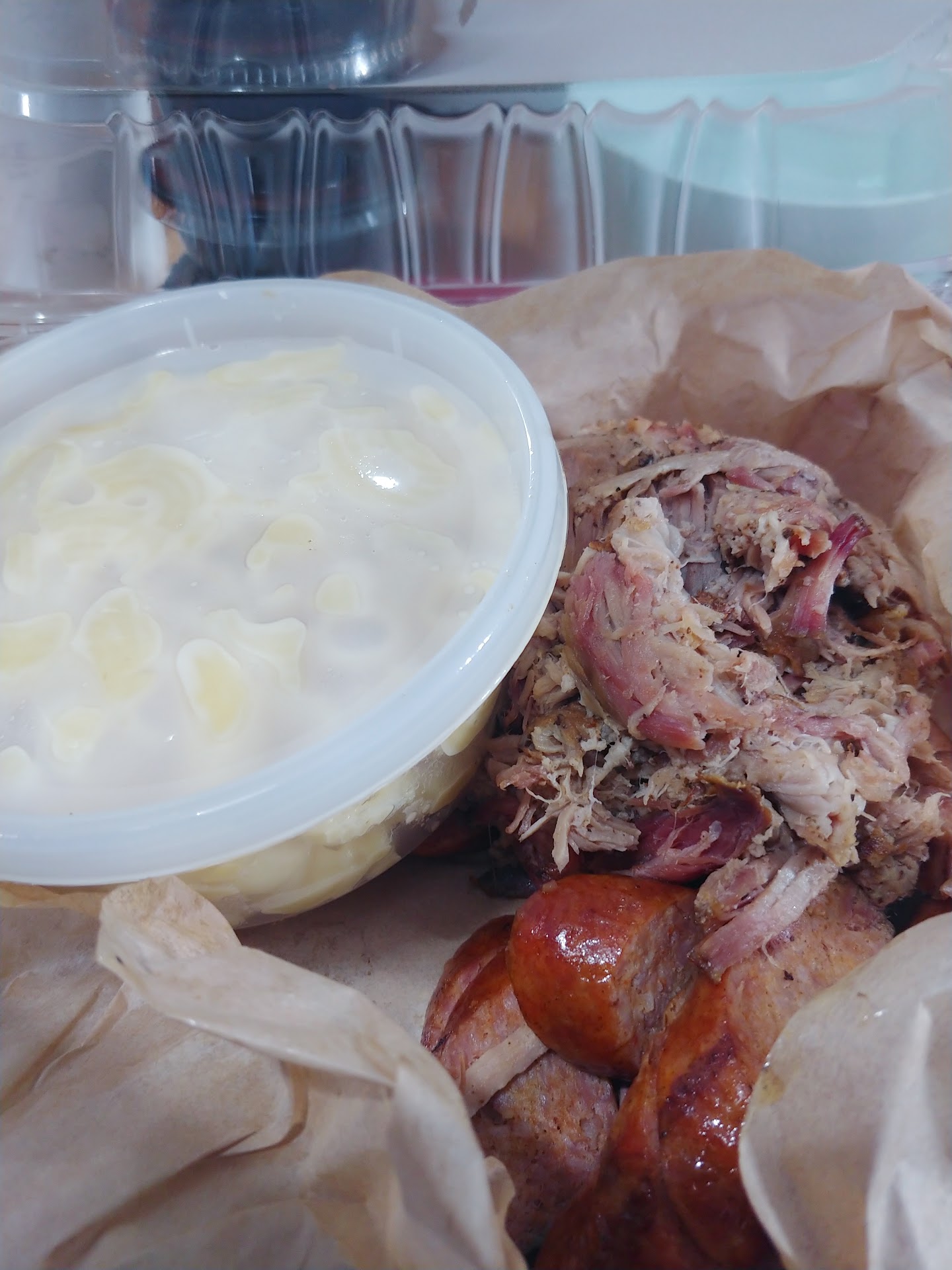 .. Went in around 3 and it was pretty empty since it was between meals. Plenty of employees there so no one was stressing out. Big menu board was handy but I would have been more confused about the offerings had I not looked this place up online beforehand. I had heard good things and wanted to check it out. They serve soft drinks and lemonade. I got their spicy sauasage and it's definitrly spicy. Hush puppies were bigger balls than expected and pretty good. They didn't make the drive home. Mac and cheese is pretty basic but mixed with the pork and sauce. Soda was not flat so that was a plus. The employees were friendly and helpful. The food wasnt what I would call amazing but it was a good experience and I really want to try their ribs. My family likes it and I will return...