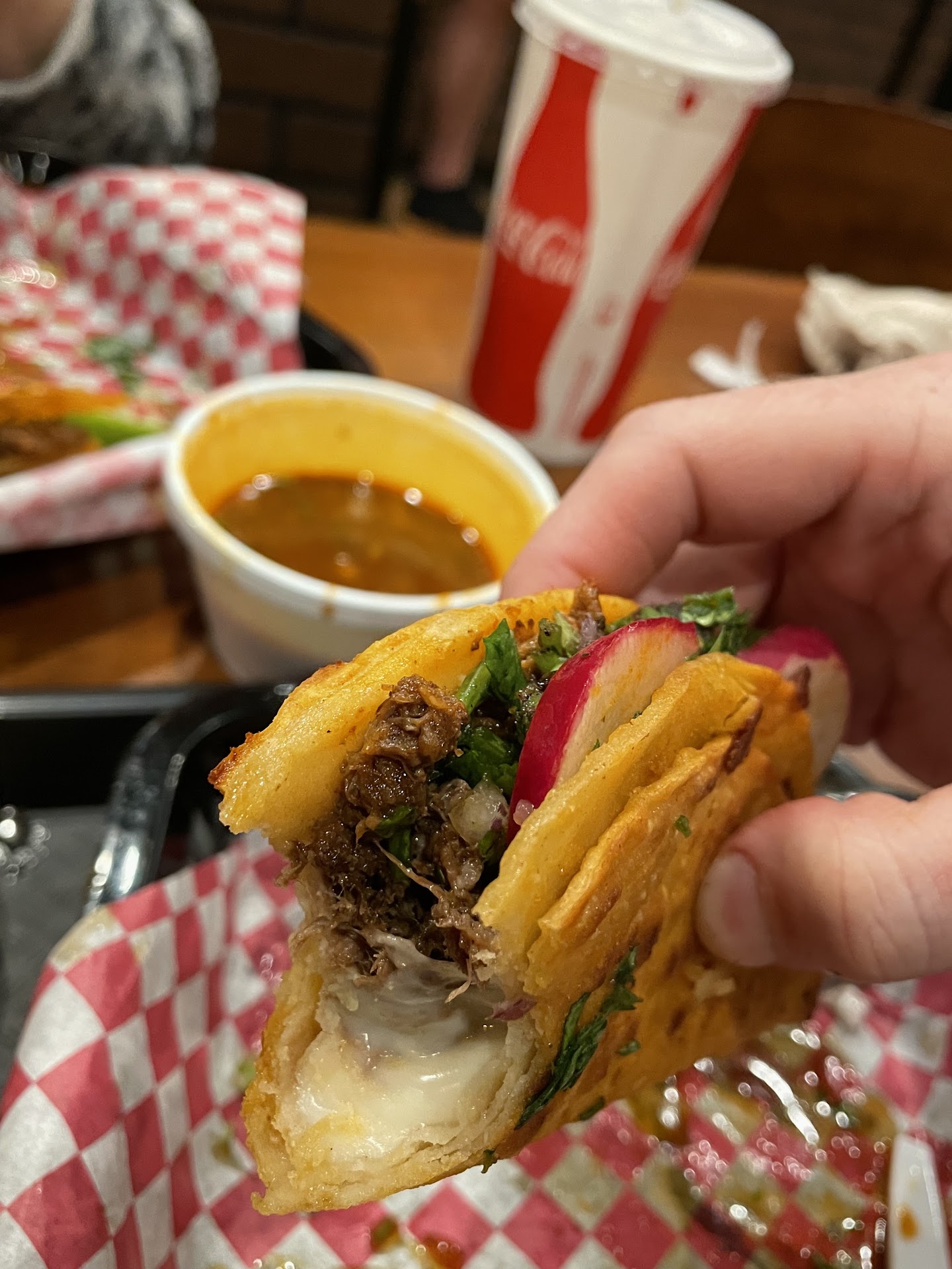 Read moreDid I miss something here? Why so many rave reviews? I make better tacos at home than these! Donât get me wrong, they look great but the cheese didnât even add any flavor. There is one type of meat that doesnât have much flavor⊠but does offer different types of shells. It was only tolerable because I dumped red onion, cilantro and lime on it. It was a greasy, drippy, mess! Even my half Mexican fiancĂ© was disappointed. They gave me a buzzer when they could literally easily just call out a number or name, which would have been better since my buzzerâs battery died. After waiting what seemed longer than everyone else⊠the girl was just standing behind the counter on her phone while my food got cold. She just shrugged and said, âYeah, sorry it must have died.â How about bringing it the 5 feet to my table when it was obvious I wasnât aware it was ready? Anyway⊠go to Dell Taco or Taco Bell if you...