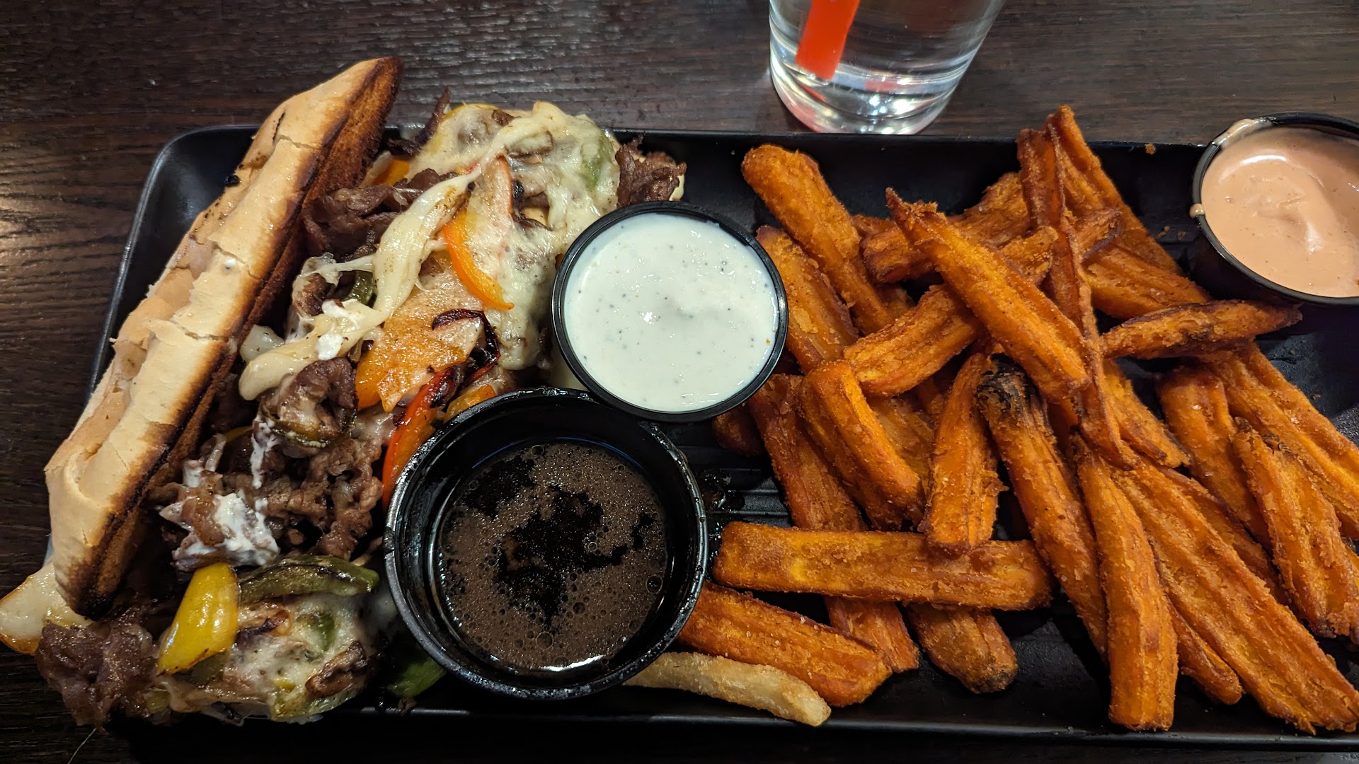 Prime rib dip w/ onions, peppers, and mushrooms: the meat, cheese, and toppings were all great, and they didn't skimp on the meat. The bread was pretty good, but the bottom bun was... you guessed it... soggy before even dipping. The au jus wasn't very flavorful, but the horseradish aioli that came on the side was a nice addition (not too much of a punch though).