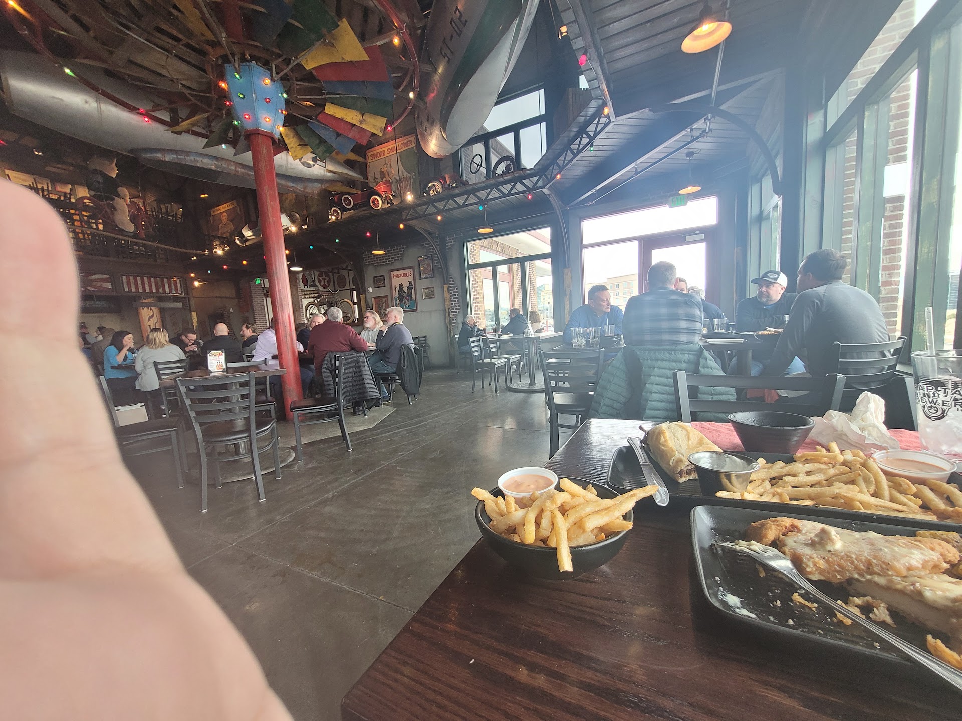 The food gets about 4 points. We shared the coconut shrimp as an appetizer. It was good, if slightly overdone. Also, odd numbers of items make apps difficult (5 shrimp? Just round to six...). My wife had the ahi tuna salad, which again - was quite good, but cooked a little tougher than is common. I had a reuben, which was better-than-average; they use a true marble rye (getting rarer these days, and I am a connoisseur of reubens; it's my benchmark sandwich), with properly thin-cut roast beef and the right amount of sauerkraut and dressing.