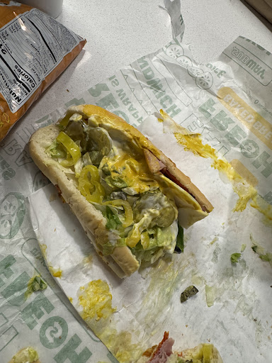 Read moreHorrible Subway!! Definitely won’t be going back. Go in to pick up my online order and all 3 employees just stand there with their arms folded, staring me down and not saying a word. Tell them I have an online order. The guy literally shoves me my sandwiches without saying anything and goes to walk away. I kindly asked if I could have my 2 large drinks cups and he also pretty much shoved those at me. As I am getting my drinks filled up, I notice all 3 of them are once again standing there, staring me down with their arms folded giving me a dirty look. Got home and my sandwiches were a DISASTER. They were so hard to eat and the one was completely wrong (the one pictured was the worst and the banana peppers were not on there to begin with. They were on my the other sandwich that wasn’t supposed to have them). Didn’t ask for mustard at all on this sandwich (or any of them) there was A LOT of vinegar on it instead of the MVP Vinaigrette, it was a DISASTER there was so much mustard (that I didn’t ask for!). It was really hard to eat because all you could taste was mustard. NEVER GOING TO THIS ONE AGAIN. I will drive the extra 5 min to go to...
