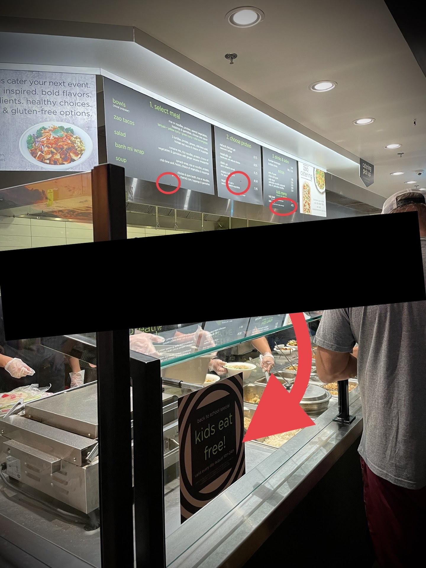 The tricky part with the free kids meals is that you have to type the promo code yourself on the card reader. The young woman at the register could have spoken a bit clearer, but missing it was my honest mistake. Resolving it was a bit trickier. Eventually the staff canceled the transaction and gave us the meal for free. It seems manually entering the promo code is an unnecessary step, but the staff handled this situation well.