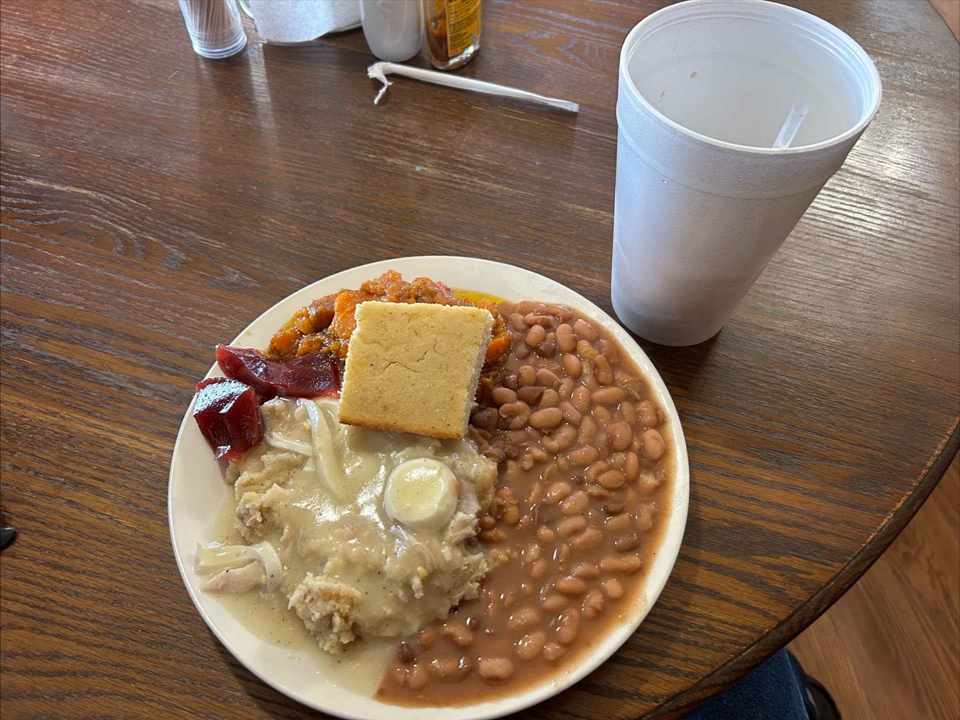 Anyway between everyone in my party, we got pork chops, cheese burgers, ribs, macaroni and cheese, collard greens, fries, corn bread, and pinto beans.
