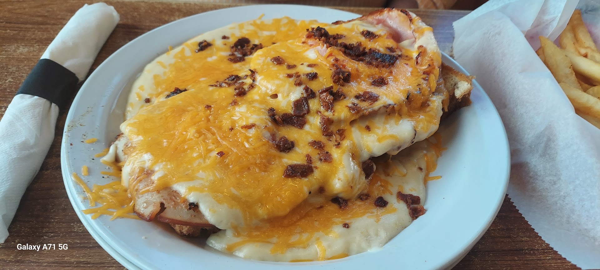 Read moreI ordered the patty melt with fries. It consisted of 2 meat patties covered in sautéed onions and cheese served on Texas toast. The sandwich was very good, but the meat was a bit overcooked and rather dry. The accompanying fries were cooked to perfection and perfectly seasoned. My wife ordered the Farmer Brown, their take on a Kentucky hot brown. There are 2 choices, a half order or a full order. If you order the full order, you should fully expect to take half of it home to eat another day. The portion size is large. The open faced sandwich was very tasty and covered in piles of deliciousness. My only complaint is that the ham was tough to cut. The bite I had was very good, though. The prices were fair, the service was top notch, and I would definitely eat here again if I'm in town.