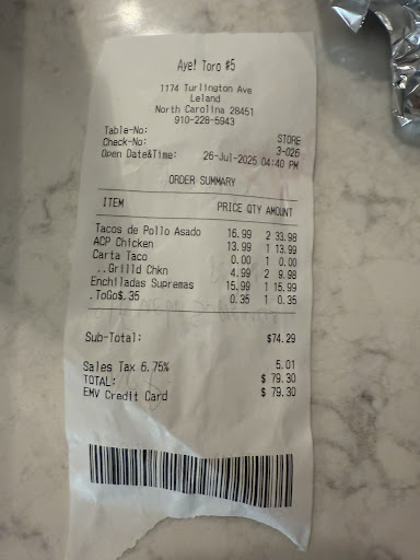 This is our 2nd dinner at Aye Toro. Our 1st dinner was one week after opening. We dined at the outside patio, service was prompt but not rushed, friendly staff and food was good. We returned last night knowing alcohol is now served. No one was dining at the patio because alcohol was only served inside. The atmosphere was loud and service appeared chaotic. Our server struggled with English, so I used a translation app to speak Spanish. It was apparent that the bar was anticipating that most would order margaritas. Pre-made mixture with small amount of tequilla in oversized glasses. I watched the servers bringing additional shots of tequilla to several tables as people poured them into their margaritas. We ordered chicken fajitas and chili rellenos. The chicken was over cooked with most of my chicken in shivraled burnt pieces. My side dish was supposed to have lettuce, rice, beans and sour cream. No sour cream, just a vertical drizzle over the lettuce. The chili rellenos were sopping in a cream sauce and the quality of the chilis were so thin, they fell apart and tasteless. Servers appeared rushed and chaotic with dishes being cleared and disposed in a rolling bin very loudly. Food from previous tables were left on floor and not swept up. It was an awful experience. There was plenty of wait staff but we felt rushed and frustrated trying to communicate with our server. This was not a late dining. It was 6pm. Never returning. Really disappointed and I hope management reads this review. Train staff, slow down and take pride in cooking enteees. Most of all make real margaritas, not the ones you would buy at a Carnival. ...