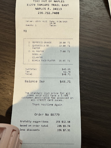 I stopped in at the Tiki Hut of Naples for lunch recently. I ordered a Cuban sandwich with fries and an Arnold Palmer. The service was very good. The bartender took my order and brought my my drink right away. She checked on me a few times during my lunch, which seemed appropriate (not too often, and not forgetting me). The food was delivered to my table by the cook, who was friendly. The sandwich was delicious. My ONLY reason for 4/5 stars: my drink was canned. Not what I was expecting and on a hot Florida afternoon a 16oz iced tea drink would have been nicer.