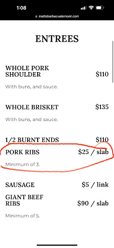 Ordered catering for our 4th of July party last year (2023): 20 slabs of pork ribs, barbecue sauce (included), cole slaw (included), potato salad, and mac + cheese. Food was delicious apart from the cole slaw which was just average. They were kind enough to take our large order only several days before our party, which was greatly appreciated ā smoking 20 full slabs of ribs is no joke!