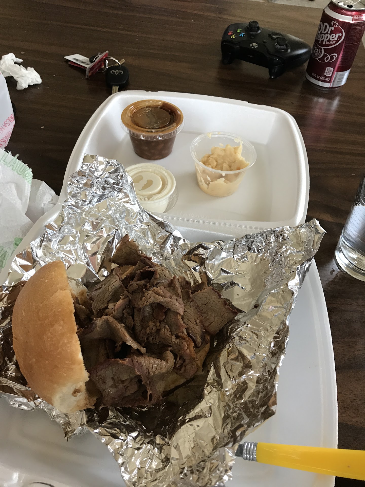 Gotta say been trying to eat here a week. Finally got it and I was highly disappointed. The brisket was very dry with no flavor. The Mac and cheese was flavorless and the cheese was separating into clumps. The best thing I had was the baked beans. Not the greatest but fine enough I would eat them again. And let's not get on the portions. 16 dollars. And the baked beans and Mac and cheese were almost as small as the cups you put ketchup in at McDonald's. Won't be going...