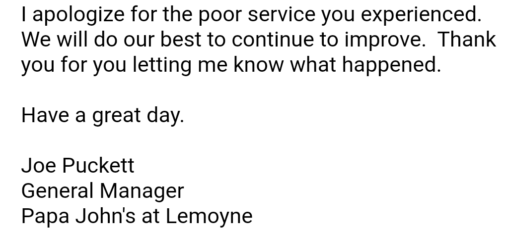 Read moreTonight was the last straw. When I ordered from a restaurant, I expect my food to be delivered hot and my drinks to be delivered cold. I don’t care who delivers it. It is the reputation of the restaurant that is on the line. I have ordered three meals from this location in the last month. Every meal has been delivered lukewarm, and my Dr Pepper‘s have been delivered warm or lukewarm. The most depressing part about this is I called the store tonight to let them know that their delivery is hurting their reputation because I’m not wanting cold food. I didn't ask for a refund I just wanted them to be aware of the situation. The person on the phone laughed it off and basically said well you got it within 15 minutes. It's 34°outside if the food is not kept in a warm container it gets cold. The driver didn't bring my order in a food bag to hold in heat. The cheese is not melted they're just sticks. I will never order from this location again and Domino’s has my pizza order from now on.. The sad thing about it is Domino’s is farther away from my home than Papa Johns. Domino’s always...