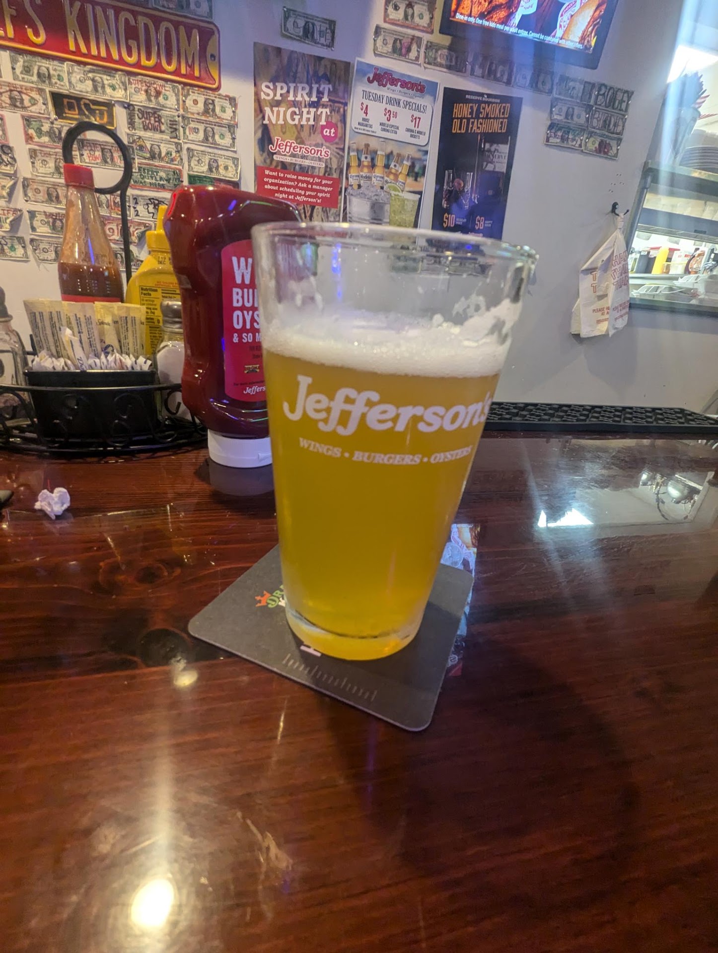 I visited Jefferson’s Wings, Oysters and Burgers in Lenexa on Monday, March 18th with the intention of enjoying some oysters. The server approached my table to take my drink order, and I opted for the Mexican Mule, which was satisfactory. Upon receiving my drink, I proceeded to place an order for half a dozen Oyster Rockefeller accompanied by cocktail sauce, horseradish, and lemon wedges. Unfortunately, the server seemed overly eager and repeatedly inquired if I wished to add additional items to my order, which I found somewhat intrusive.