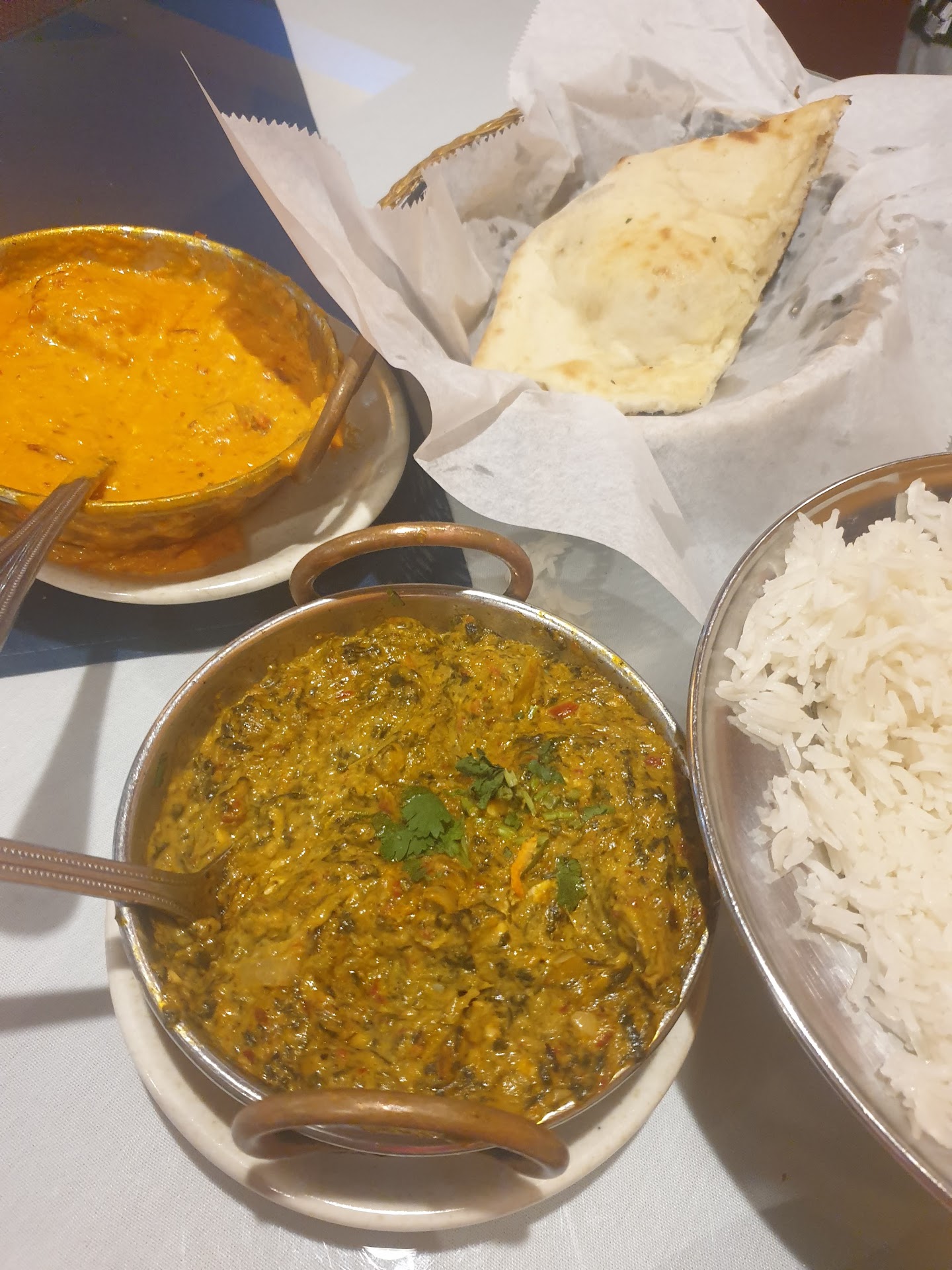 We ordered the Vegetarian dinner for 2. We ended up seeing 4 different servers during our dinner, but they all came very sparsely. The bathroom was locked at the time also and unavailable for use. When we first sat down a man gave us chutney but we said we were ready to order and he said the woman would come by to take it. We waited quite a while for her to eventually come, and didn't see her until the very end when she finally refilled my empty water. I had given up and started drinking my husband's. When the curry came out the chef said a comment like "Her is your rice, don't be angry" in a singing voice, but we had never made any angry comments or looks to anyone so it was confusing. We also got our naan but it was overdone and had to send it back for new naan. Additionally, according to the menu the desert is supposed to be gulab jamun, which is my favorite, but it was swappes put for toffee ice cream without staff mentioning anything. We did get a free mango lassi and we also received chai tea so that was nice. The girl who came at the end of our service to wash our hands was very kind and friendly. The food was all good but not noteworthy. It ended up being 46 without our tip included. Overall, it was a fine dinner but I probably won't be back.