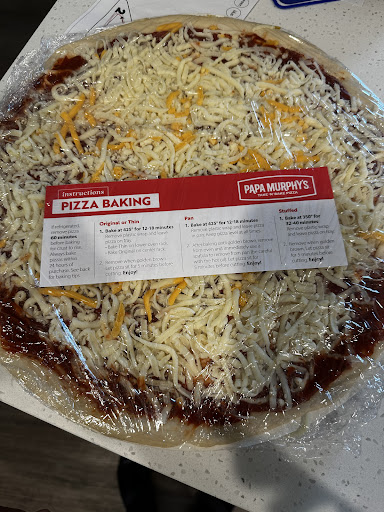 Read moreI have to stop a minute to write this review, the manager who was working the shop today is always so professional, so nice and so efficient. I never have to wait long for my pizza. They use such great fresh ingredients. The veggie pizza is one of my favorite. Today I ordered something different. Chicken pizza with creamy sauce, green onions, tomatoes and herbs. I added mushroom because I like them. Its ALWAYS smart to get the family size. People, this pizza is just as good leftover as it is when you first cook it at home. I am a total convert. I will NEVER get pizza at any chain ever again except for PAPA MURPHYS. Im so glad to say the new manager seems to be doing a superb job. Thank you! I will be back soon....as soon as left overs...