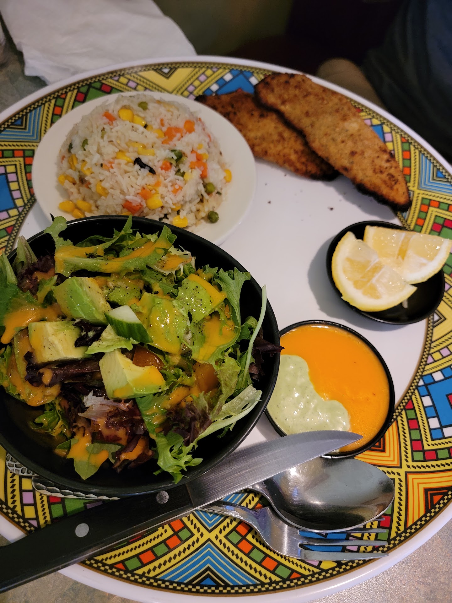 I informed the waitress about the unpleasant experience with the food and she seen we hadnât eaten much and she was stale and unpolished in her apology. We still paid the full price for the ticket but definitely wonât be back! She snatched the plates before I could get a pic of my son and husbands! I did snap mines. It was so horrible I didnât even take it to go! I only ate the tomato dish that was extremely spicy! The only thing on the plate that had some flavor!