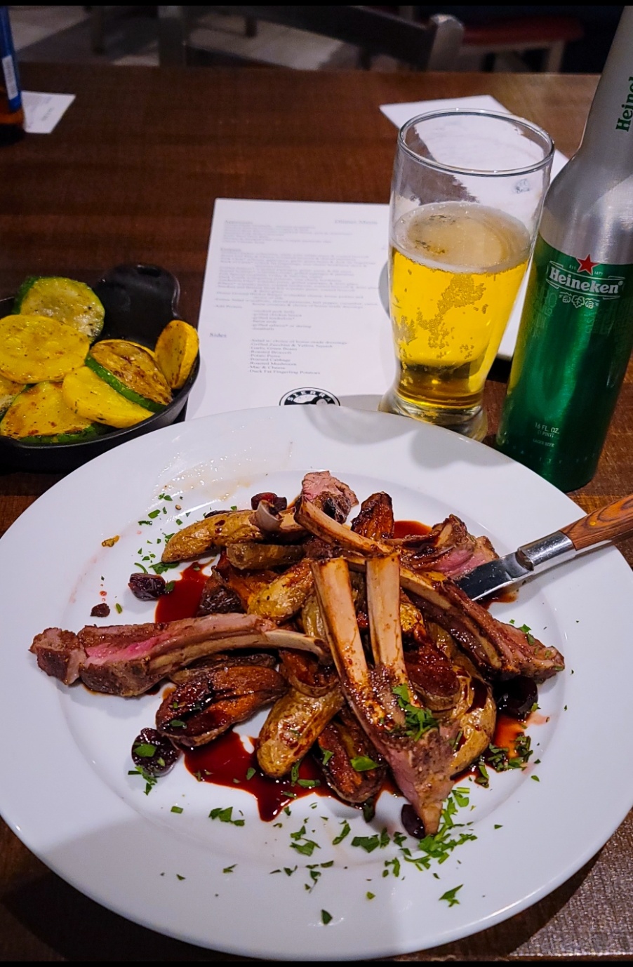 The far worse offense was the vegetable side. It's $6, and the current seasonal vegetables are zucchini and yellow squash. With squash currently selling for about $0.99-1.49/lb, one would expect to get the equivalent of a single squash for $6 at a good restaurant. Instead, what we were presented with was a small plate with seven thin slices of squash... I estimate that it was about 1/10th of an average size squash. That wasn't just surprising, it was insulting. Like everything else, the flavor was great, but to ask patrons to pay $6 for that is ridiculous. To have that kind of an up charge, you'd need to back it up with 5-star service, and even when they aren't under-staffed, this isn't the kind of place that is setup for that level of service. To be honest, I'd be shocked if Eddie V's (the closest thing to 5-star I've found in KC) charged me $6 for that meager plate.