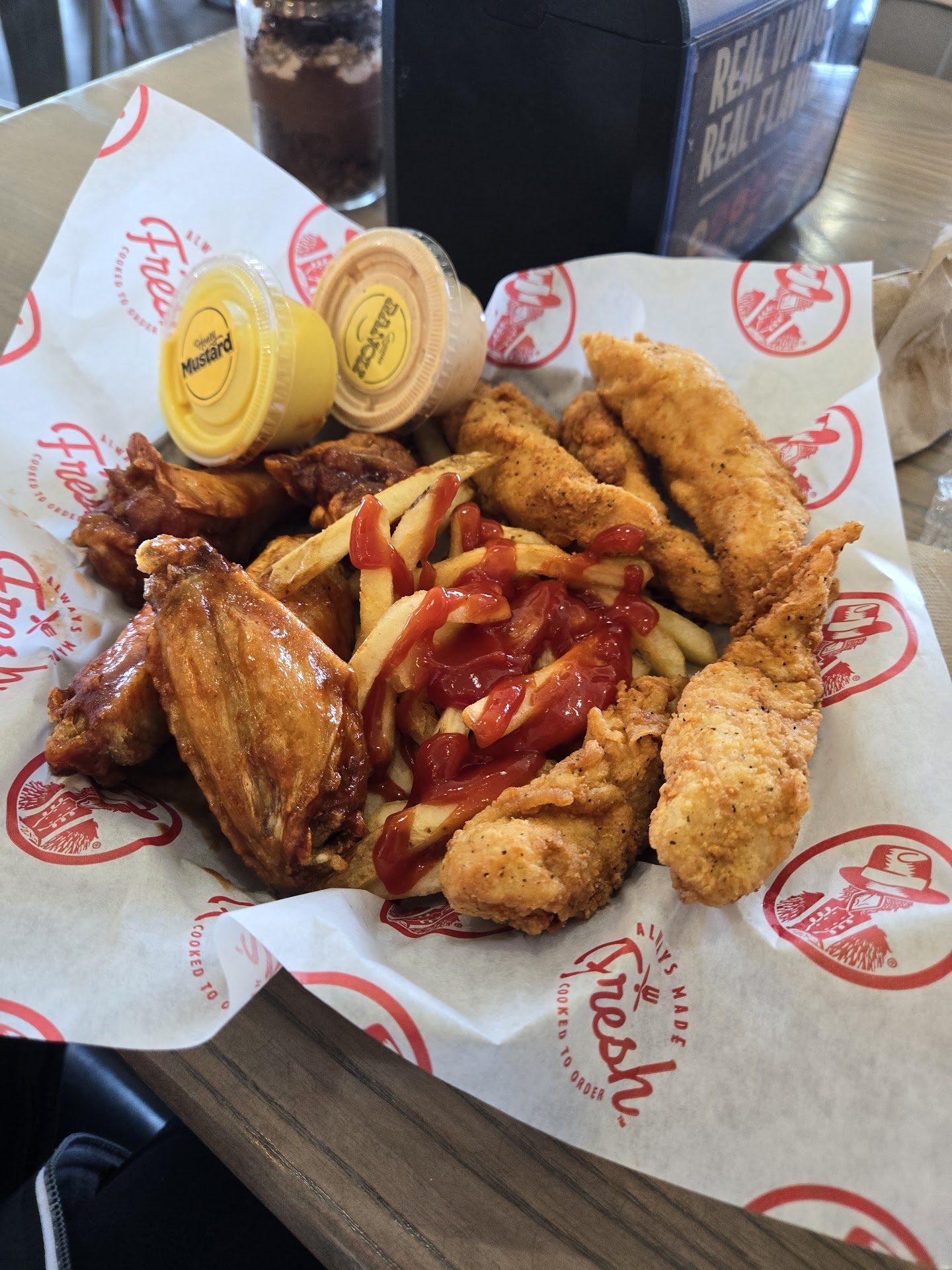 Read moreI ordered the 6 wing dinner at the counter because the drive through was backed up and for some reason I thought it would be faster inside. I was very wrong. It took 35 minutes to finally get the take out. The receipt had the time I ordered and checked my phone when I got the order. When I got home and opened the bag, at least my order was right. It was best part of going to Slim Chicken. Chicken wings were all the joint sections not one drumette. I realize fries get limp as they cool but these were like noodles with salt poured over them. I live less than 2 miles away so expected them not to be hot but not limp and cold with far too much salt. If I had eaten there I would have taken them back. Slim chicken is a good name. The wings were the smallest I've ever been served and were like chicken skin jerky. The blue cheese dip for wings must be artificially flavored. To make sure it was blue cheese after sampling a taste with a spoon because it looked like ranch dressing, I put it through a strainer to check and two cups ,one I had to buy, had no blue cheese. It had a blue cheese taste, but no cheese. I'm not trying to be nasty about the food or service, it is just how it was with my order. Can't say how other people feel about the food but the long wait was the same for everyone and heard a couple people at table wondering if their order was forgot. I sat at a table to wait for my order, put my phone down and when I picked it up, it was covered with sticky mess. No wonder, nobody cleaned or wiped down tables the entire time I waited. It was easy to tell they need more help but that's up to Slim Chicken if they care...