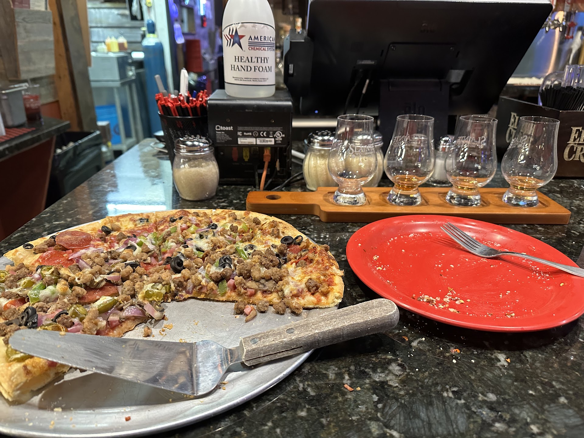 I thought this was a saloon. It is not a saloon, it is a pizza restaurant. (Old Shawnee). Separate door but both doors lead to the pizza shop. One bar serving both sides of the restaurant with a ton of brown liquors on the wall. Bartender was not that enthusiastic about her job and kept telling people she was having difficulty with the computer so she couldn’t help them, even if it was pouring a beer or grabbing a can or bottle of beer for another server. They have good pizza but the drinks are average. I got the smoked old fashioned that was not smoked. Bartender could not figure out how to use the smoker machine so she gave up and handed it to me and said “this is the best that I can do”. It tasted meh, probably 5/10 at best. Then she couldn’t get my card to work, gave her another one, couldn’t get it to work, gave her third and didn’t work and then they took the third card to another machine and it worked. Thought maybe I was out of money :). I was not. The guy next to us was trying to tab out and the bartender got all bent out of shape and said just wait a minute and I’ll get to you. She might want to consider a job behind a computer so she doesn’t have to deal with people. “Handcrafted Cocktails” is a term used too loosely in this place. Find a new mixologist. One that doesn’t have to look at the book to see what the ingredients are for all drinks. Or at the very least don’t let all the patrons see you doing the looking at the book. Wanted to try a new place on the way to our dinner and 45 mins later we were unsatisfied...
