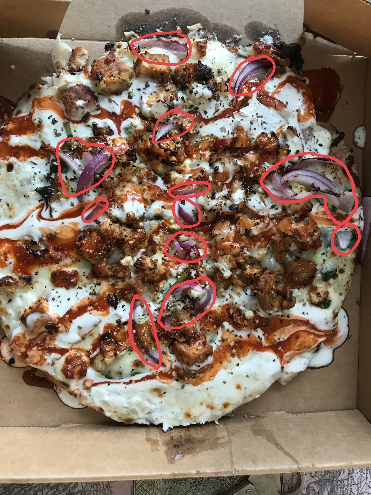In order to get the same {Buffalo Blue Cheese + Spinach + Onions + Garlic} extraordinary tastebud experience I’ve grown to love, I now have to pay the increased base rate of 9.50 + 1.50 for toppings. Please see the attached photo and explain how 20% coverage of onions justifies a 50 cent price, a markup of nearly 10x from the actual cost.