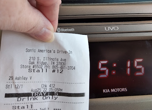 Ā Ā Ā Read moreCame to Sonic is Lenoir City this evening, ordered a cherry limeade, 2 small Oreo blasts, and a medium Oreo blast. Took 15 minutes after pressing the button to be able to order those. The medium blast was only filled 80%, which was really aggravating, but whatever. However, the cherry limeade was extremely off in taste. I was able to grab the attention of the car hop, because why wait another 15 minutes to reach someone. I told her about the limeade, and she says now you have to take the lime out, squeeze it into the drink, and drop it back in. Instead of arguing about the ridiculousness, I asked for a coke. She said she'd be right out with it. Well 15 minutes later, nothing. Tired of wasting more gas and time we left, which was probably their game anyway.