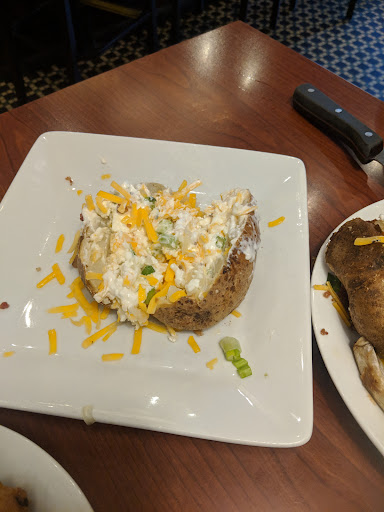 I dined with a guest. We had a Hickory Bourbon grilled chicken breast, a side salad and green beans on one order. The other was a Cajun Ribeye, a loaded baked potato, and a side salad. Dressings were ranch and balsamic vinaigrette. I drank water and my guest drank unsweetened tea.