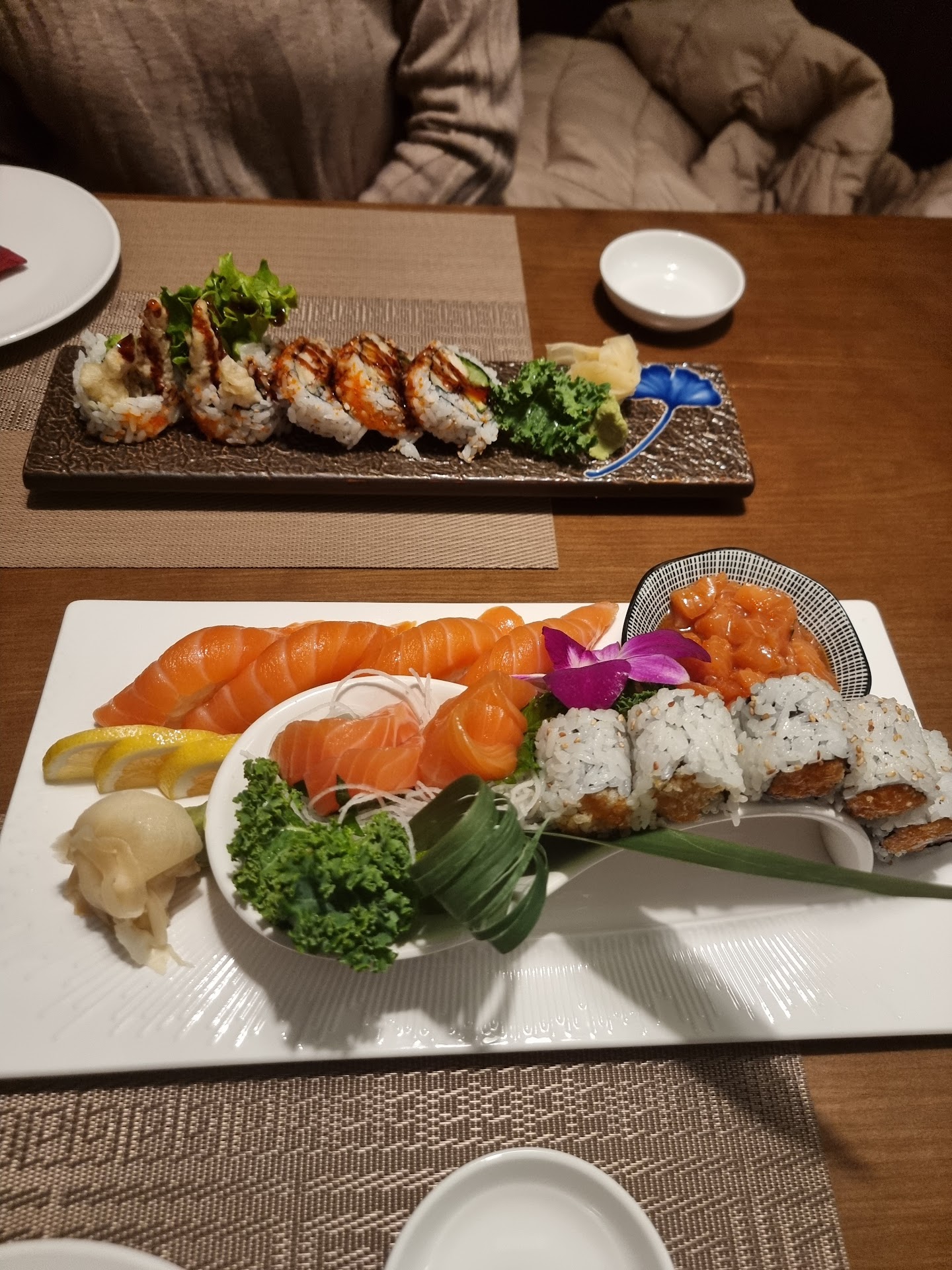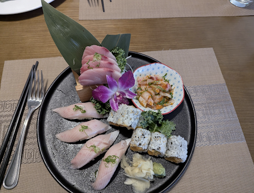 We had what began as a very nice meal. Yummy starters (soup, spring rolls) and hot sake were quite promising. Then came what I intended as a first course of sushi, and I was delighted. The "Tri-Color Sushi Platter" was a work of art in both presentation and flavor/texture combinations. The photo posted is this delightful dish -- which really did taste as good as it looked. So six stars so far.