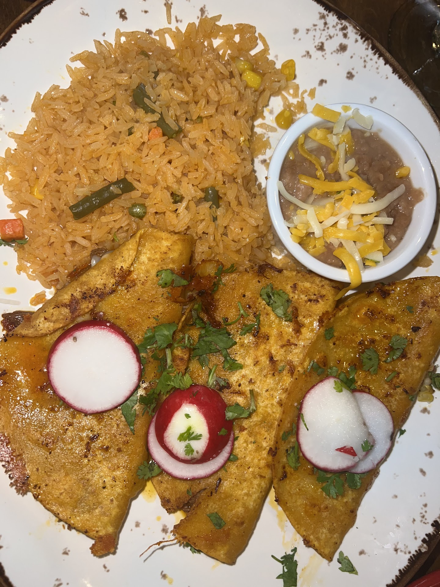 The Philly Rolls and Tacos were very good, although my suggestion to the restaurant is that the tacos should come with a lime wedge. I squeezed my margarita lime onto my taco and it really elevated it. The pork was fresh real slow cooked pork perfectly mouth wateringly tender. I was very impressed with the beans on the side as well. They tasted like fire (smokey, not spicy) and it was soo tasty. The rice was good. It was nothing special but that's the way it should be. Good texture good moisture good flavor. Philly rolls were perfect, would not change a thing. A little bite with the sauce and a scoop of the lettuce and tomatoes ah. So good. The textures and flavors all work very well together.
