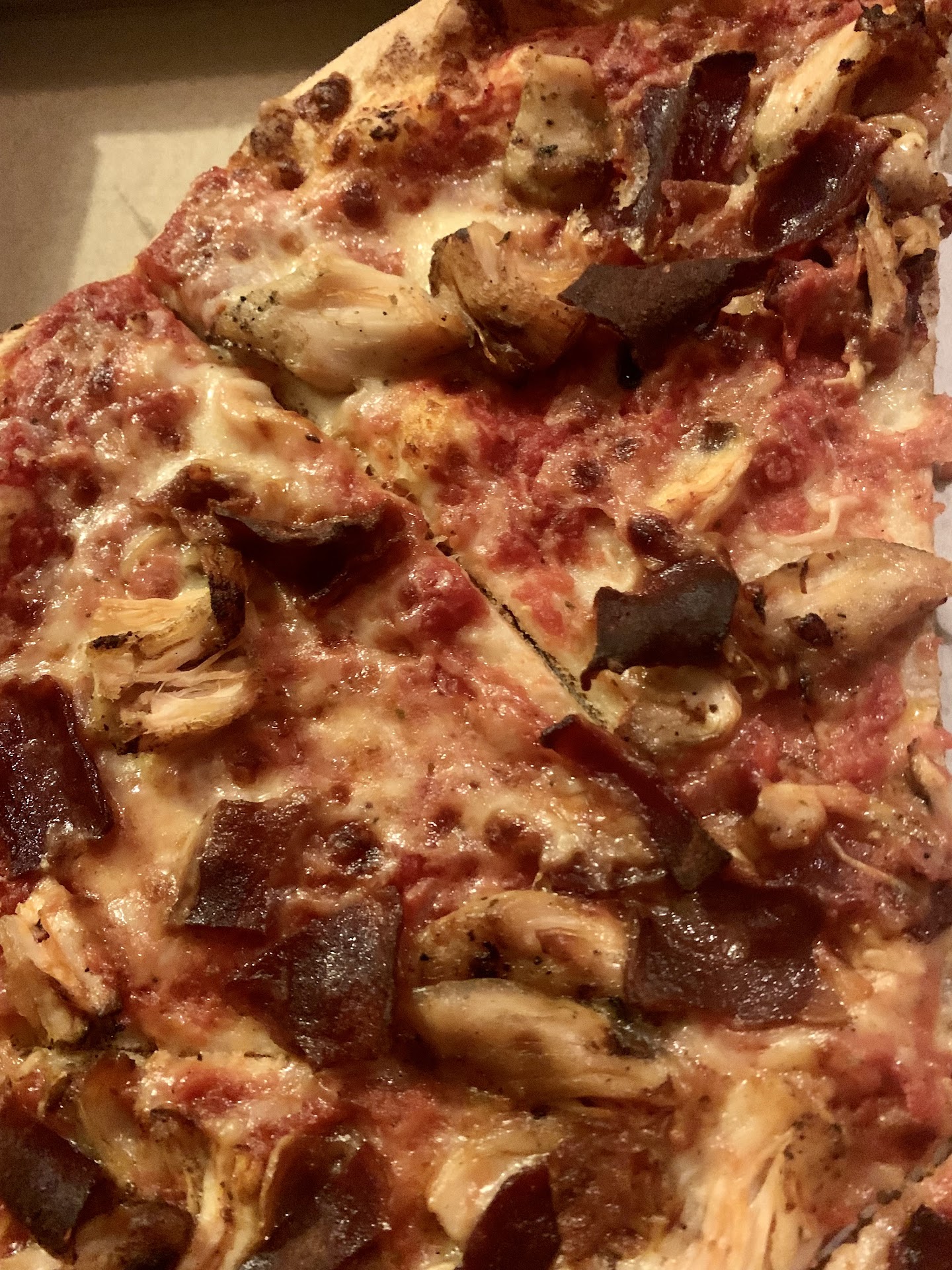 The chicken and bacon pizza was a 4/10. I liked the thin crust. Good undercarriage. Tomato sauce was decent. There were patches on the pizza that didnât have cheese. Some areas on the pizza had nothing. I could see right to the pizza crust. Imagine putting all the toppings, cheese and sauce on a small pizza. Now use that same quantity of ingredients to cover up a large pizza. Thatâs what it looked liked. The bacon pieces were crispy like pita chips. Yes, that hard. The chicken tasted fine. A bit dry but fine compared to everything else.