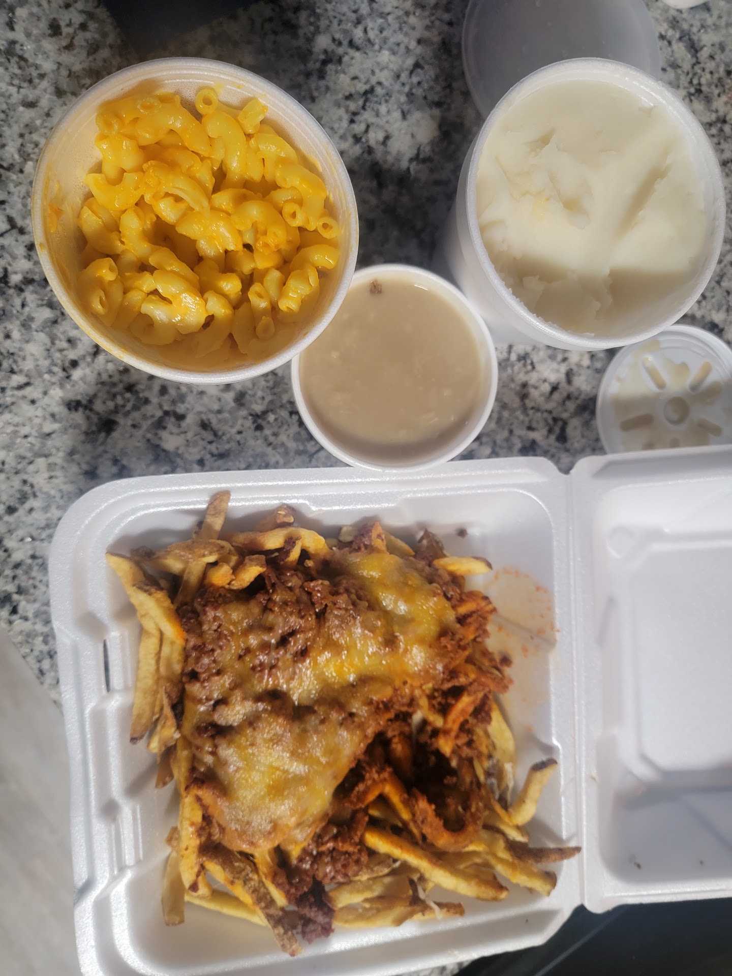 What We Ordered: Mac and Cheese, Parmesan Wings, Chili Cheese Fries, Mash and Gravy, and a Fried Chicken Family Meal w/Cornbread.