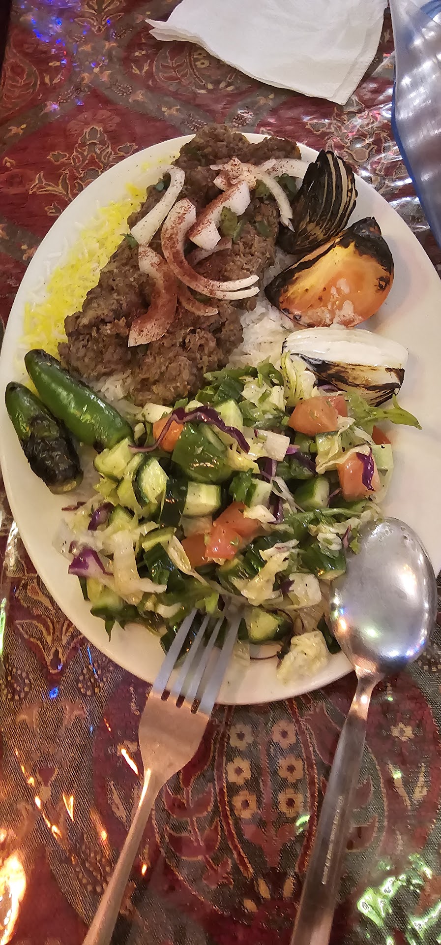 Read moreThey offer the option to sit at a table or on the elevated carpet area with pillows, which is a more traditional option for many in the Middle East and encourages socialization. This allows for a nice atmosphere for all no matter the preference of the clientele. The service was excellent and noticing we were first-timers, they asked great questions and offered options to help us. The food was well-cooked, not over spiced, and came with a variety of spicy condiments for those who like the extra kick. They even gave us a free portion of stewed chicken with potatoes and carrots as a welcoming gesture since we were new. Lastly, the Turkish coffee was very good. It didn't come out right away, they made sure it was served after the grounds had a chance to settle, so less sediment in the cup, and they served it with a small coffee flavored candy. Not sure if I was supposed to suck on that while I drank the coffee, but I did and enjoyed it. Overall we highly recommend it and encourage anyone who goes to be respectful of their customs if you are not familiar with them (there is a reason for example, that they eat some foods with their hands that maybe...