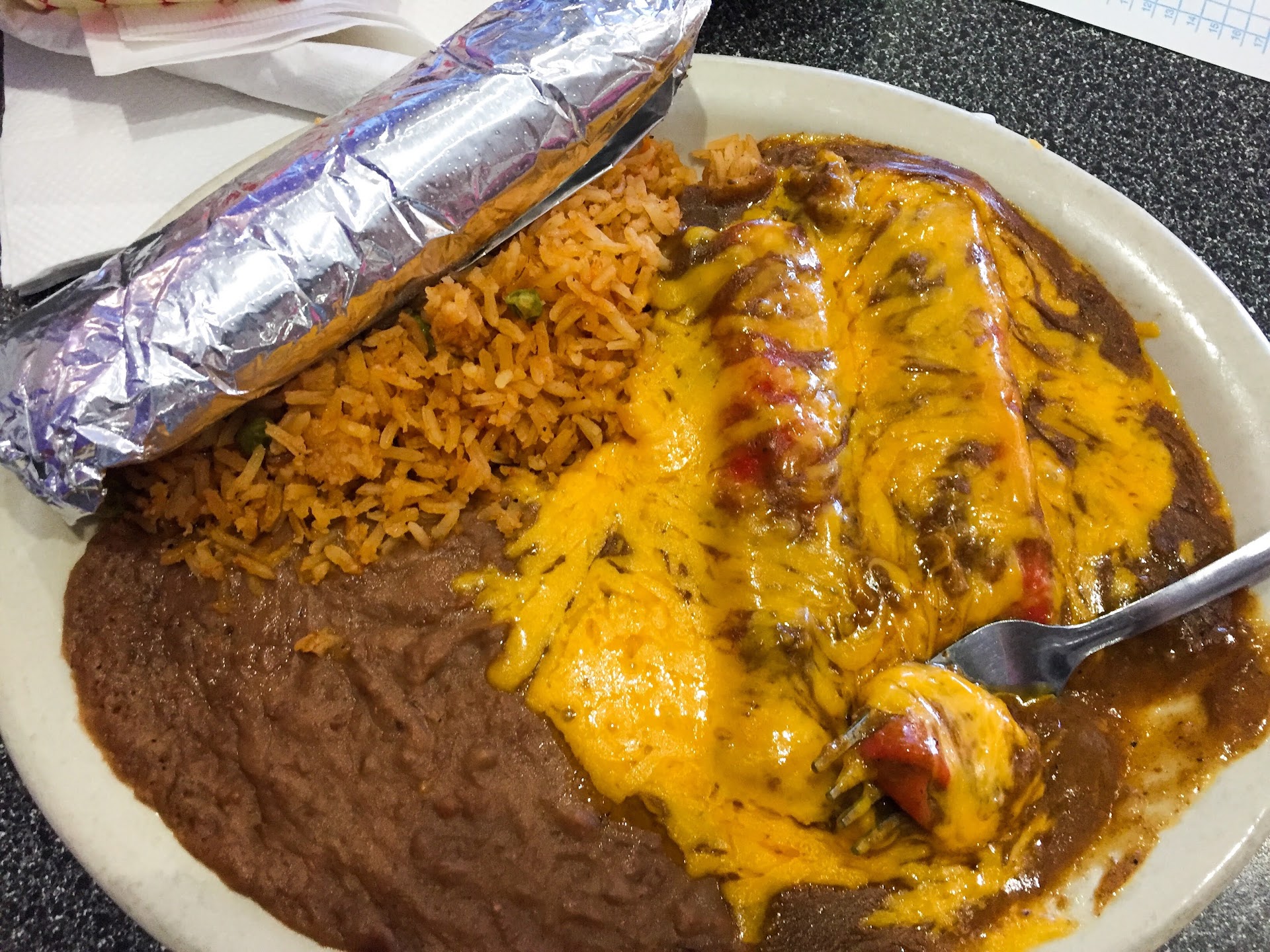 We ordered nachos to begin sampling the fare here. They came as a "piled" version rather than individually made. Quite a pile for $4. Not bad, but the beans are a little lack-luster. That being the case we quickly changed the bean portion of our plate order to frijoles a la charra which were good and a little spicy hot. The cheese enchilada was not bad, but the beef version stole the show with some nice hunks of steak as part of the enchilada "stuffing". The garlic rice was good and so was the puffy taco though grease-a-phobes be warned. You will see a slick lipid puddle on the plate after consumption.