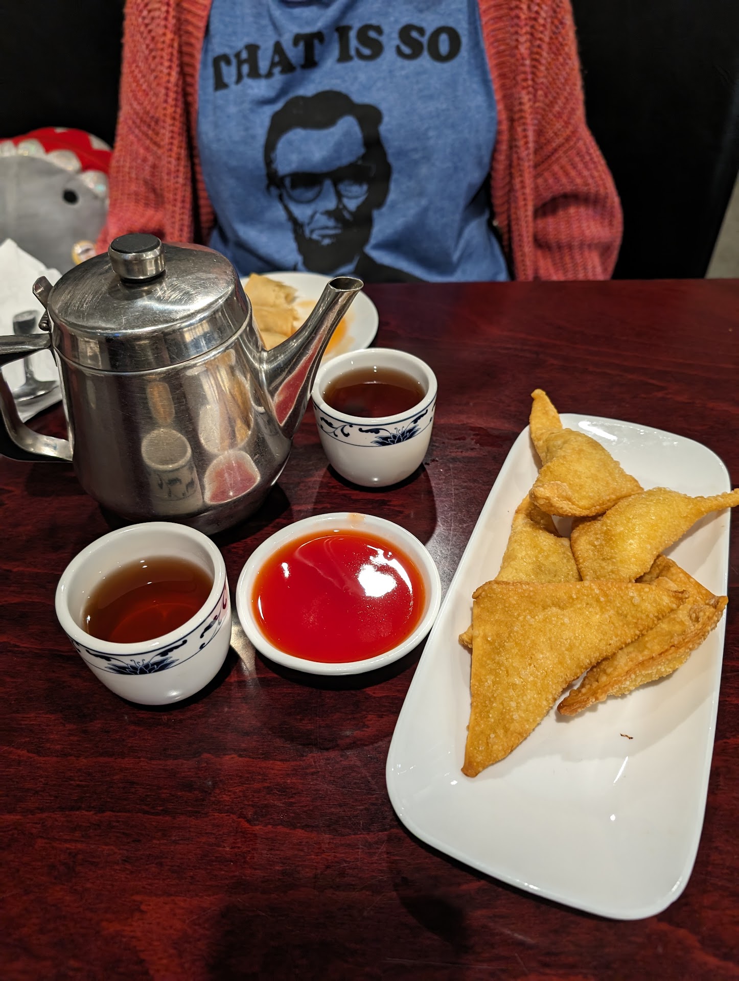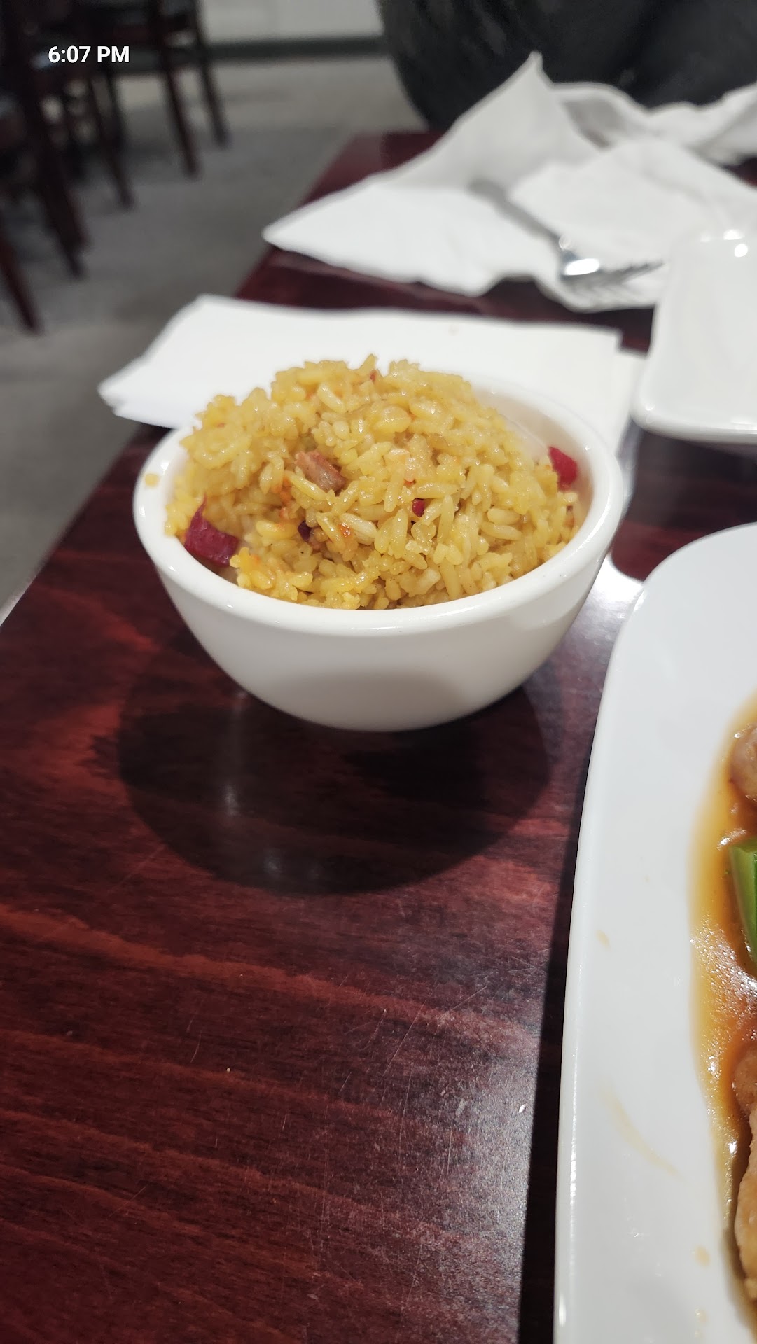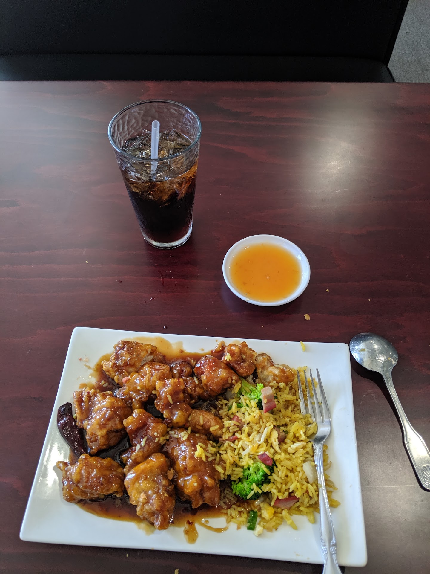 A major issue I had though is that I told the server specifically that I am very allergic to seafood so I asked if the spring rolls have any shrimp or anything and she said no, they're vegetable - the menu also said they're vegetable. So I ate them without worry. They weren't very good but whatever I didn't want to make an issue so I just ate them smothered in duck sauce which was okay. I'm almost done with the second spring roll when I just glance at it and realize there's literally a baby shrimp in it. So that was great. Lucky for me they seem to use fake shrimp because I haven't had a reaction yet and it's been at least a half hour since I ate it. After that I tried to have some won ton soup. It tasted like fish water. The dumplings were okay, not great.